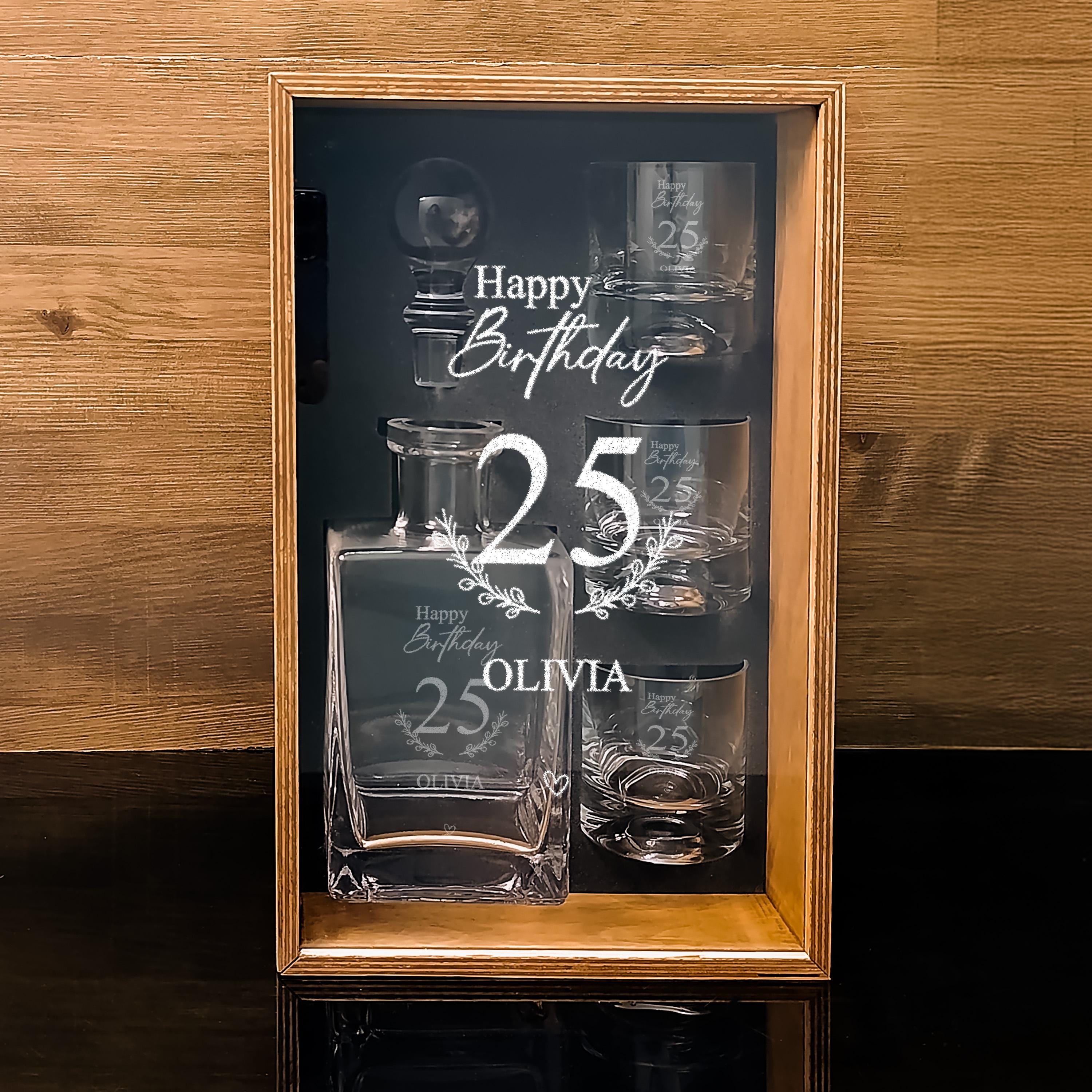Whiskey Decanter Set Engraved Bourbon Glasses Wood Gift Box Anniversary Gift