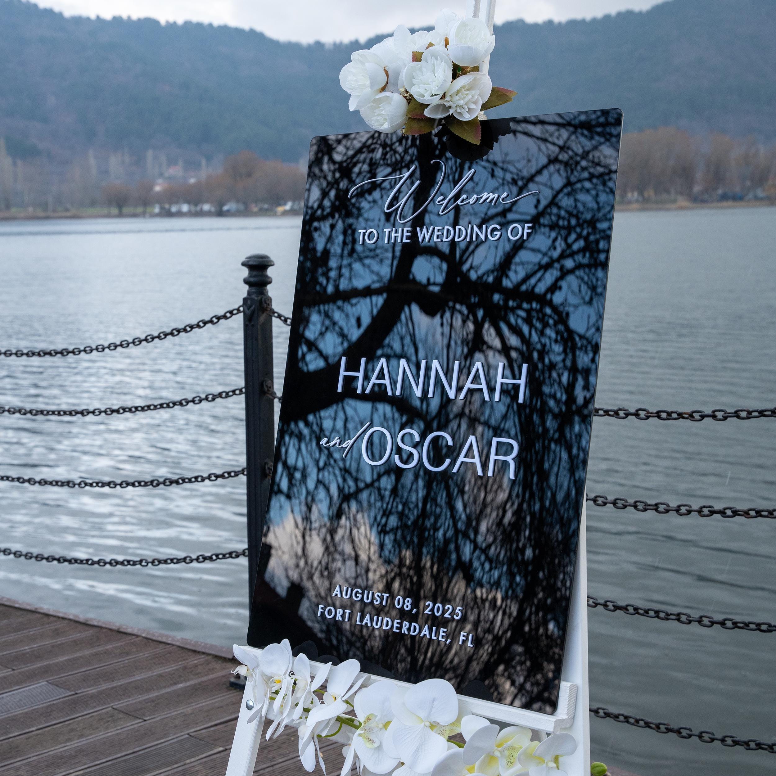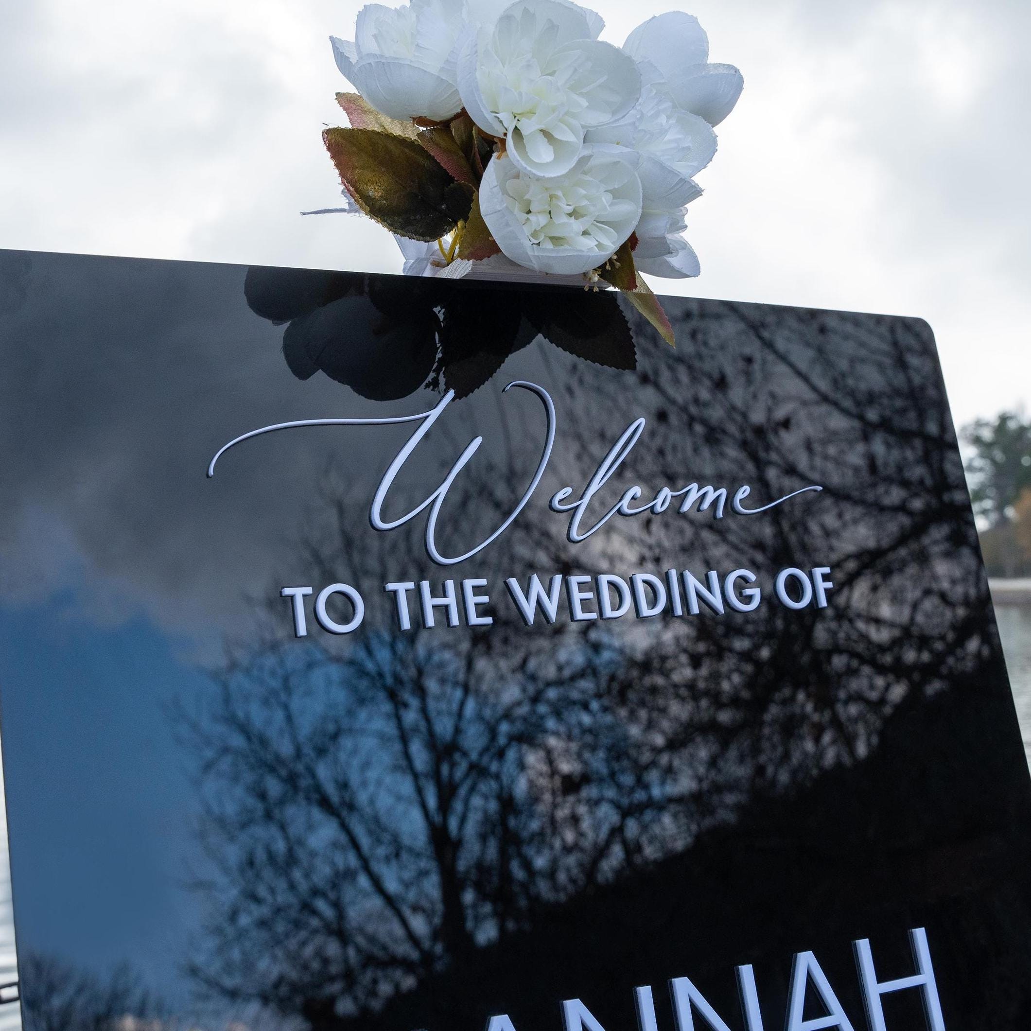 Our Black Custom Wedding Welcome Sign from the Gardenia Collection is an acrylic wedding sign designed to create a stunning first impression at your ceremony. This elegant piece features a sleek mirror acrylic arch that enhances your wedding entrance sign, setting a sophisticated tone for your special day.