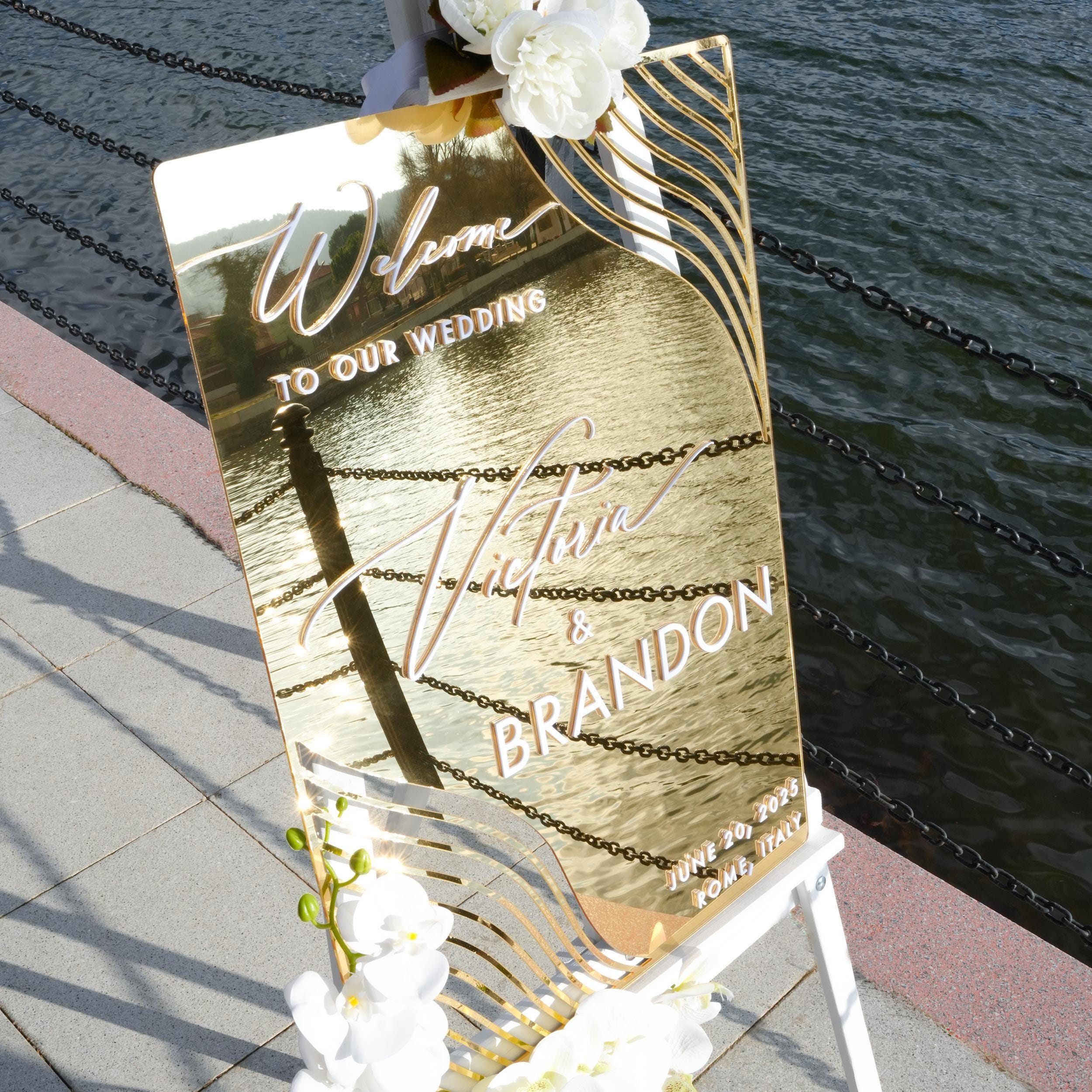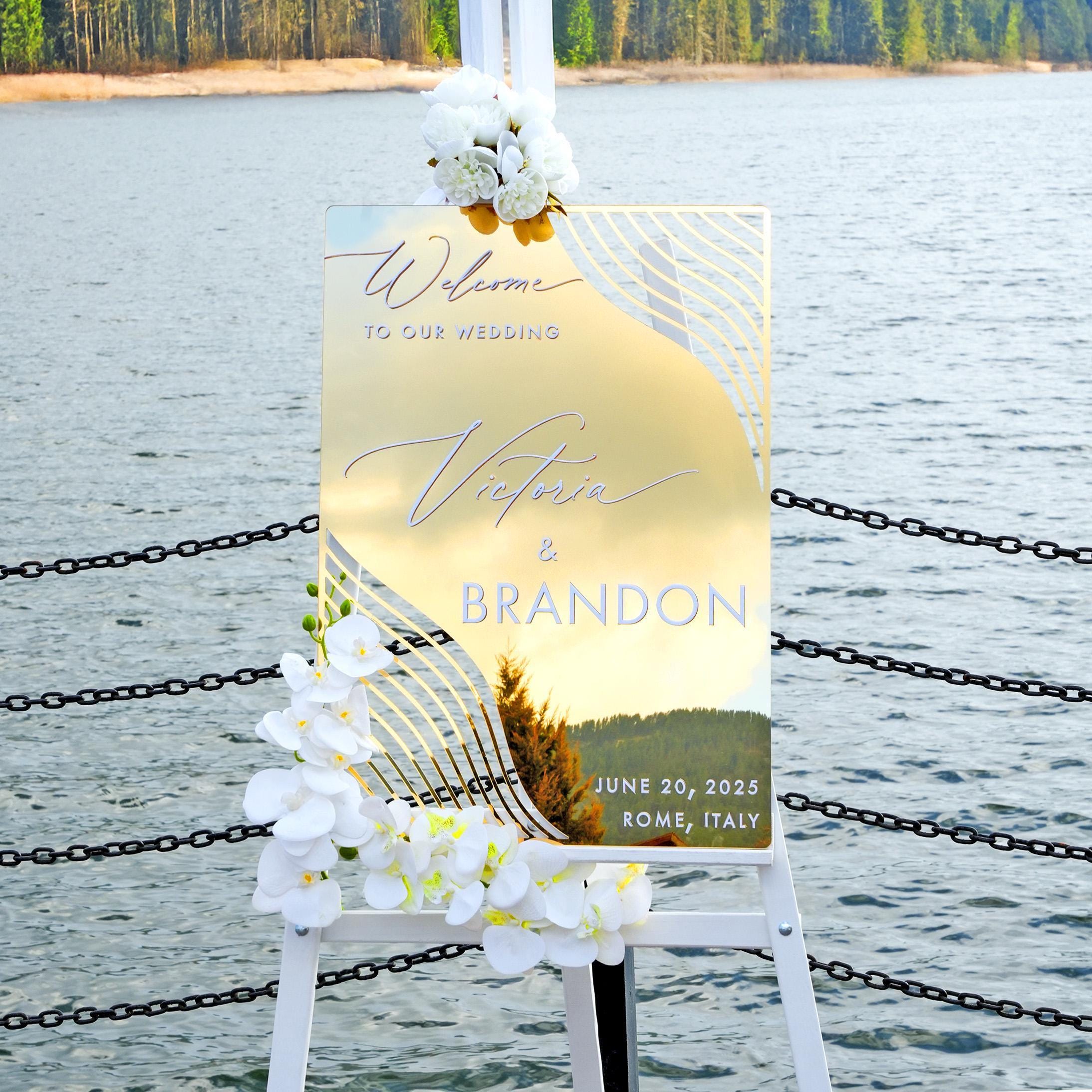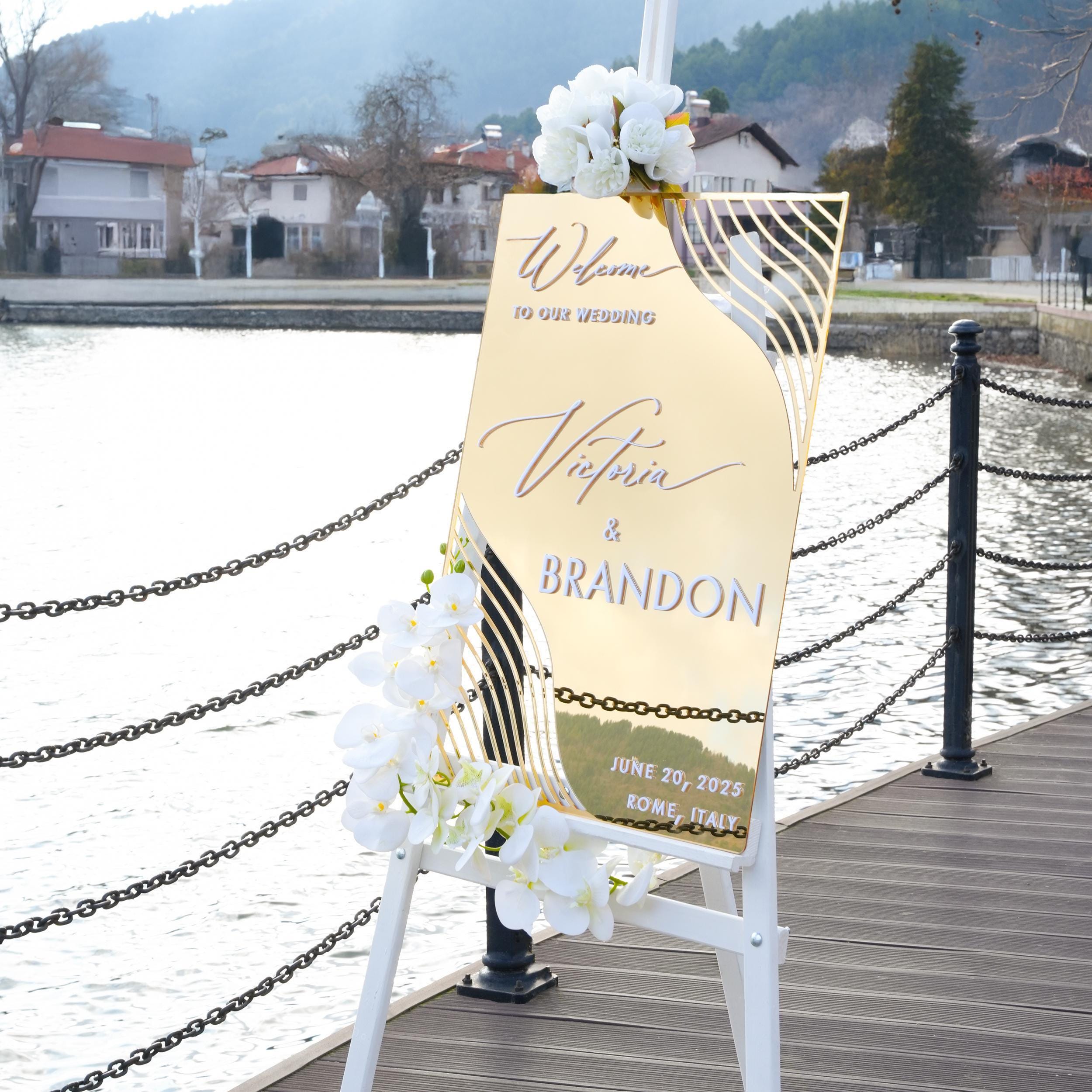 This acrylic wedding sign from the Sunflower Collection adds a stunning gold mirror welcome sign to your fall wedding, creating an elegant first impression for guests.
