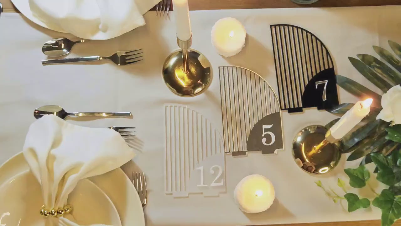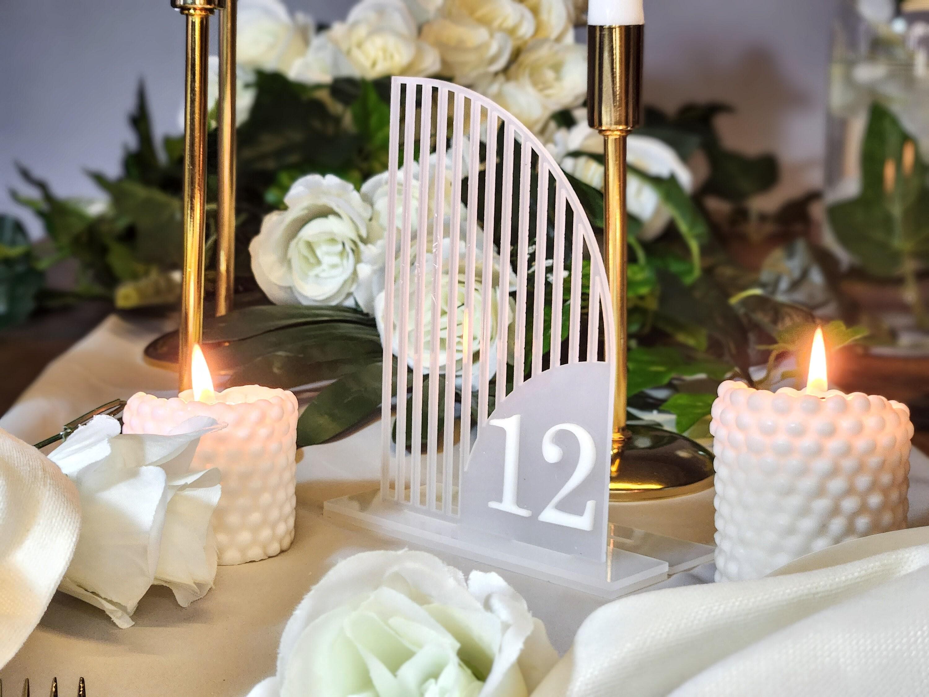 Acrylic Table Numbers provide elegant table number signage that helps guests easily identify their seats at weddings, engagement parties, and rehearsal dinners. These decorative table accents combine modern style with practical function to enhance any event setting.