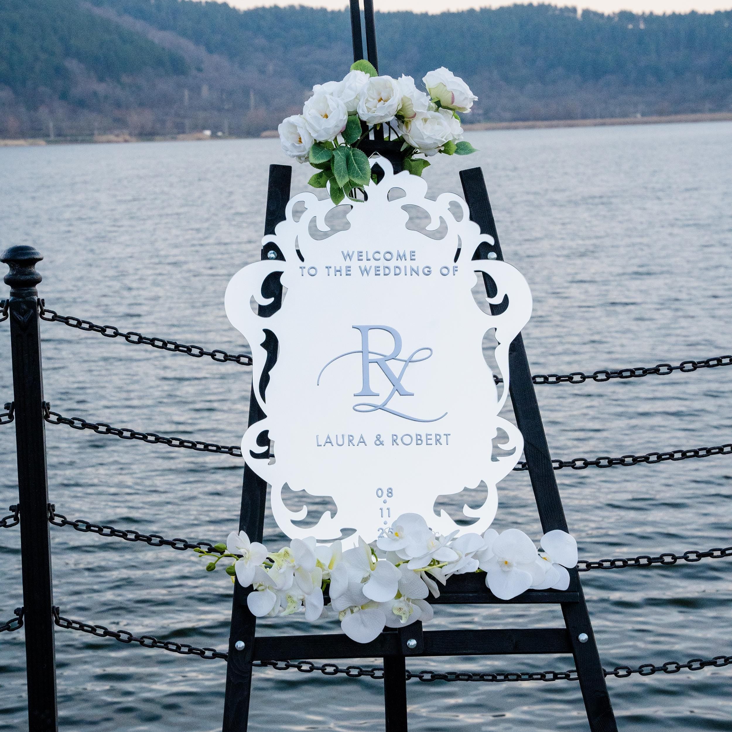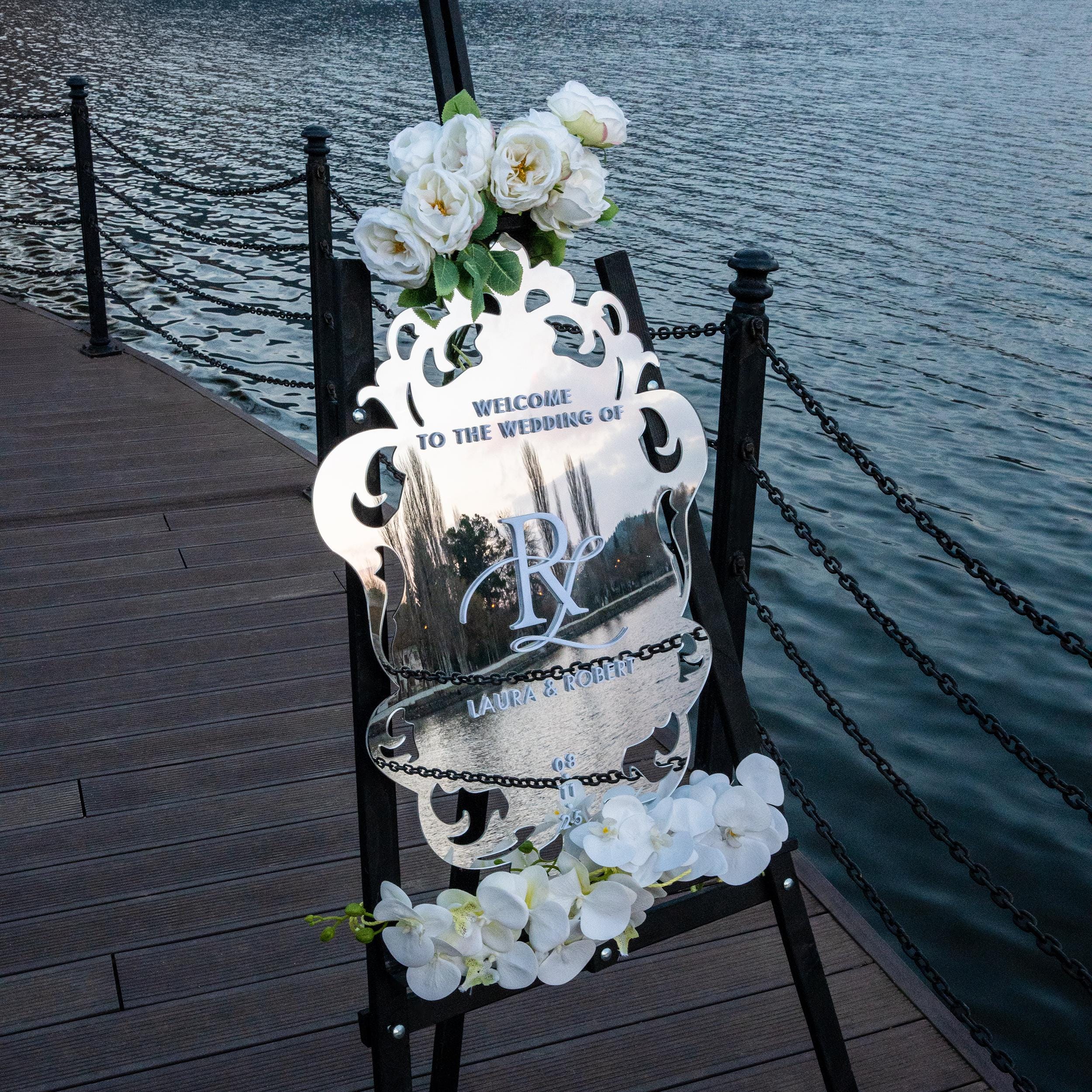 Our Acrylic Mirror Wedding Sign from the Madrid Collection creates an elegant entrance that welcomes guests with personalized style and timeless charm.