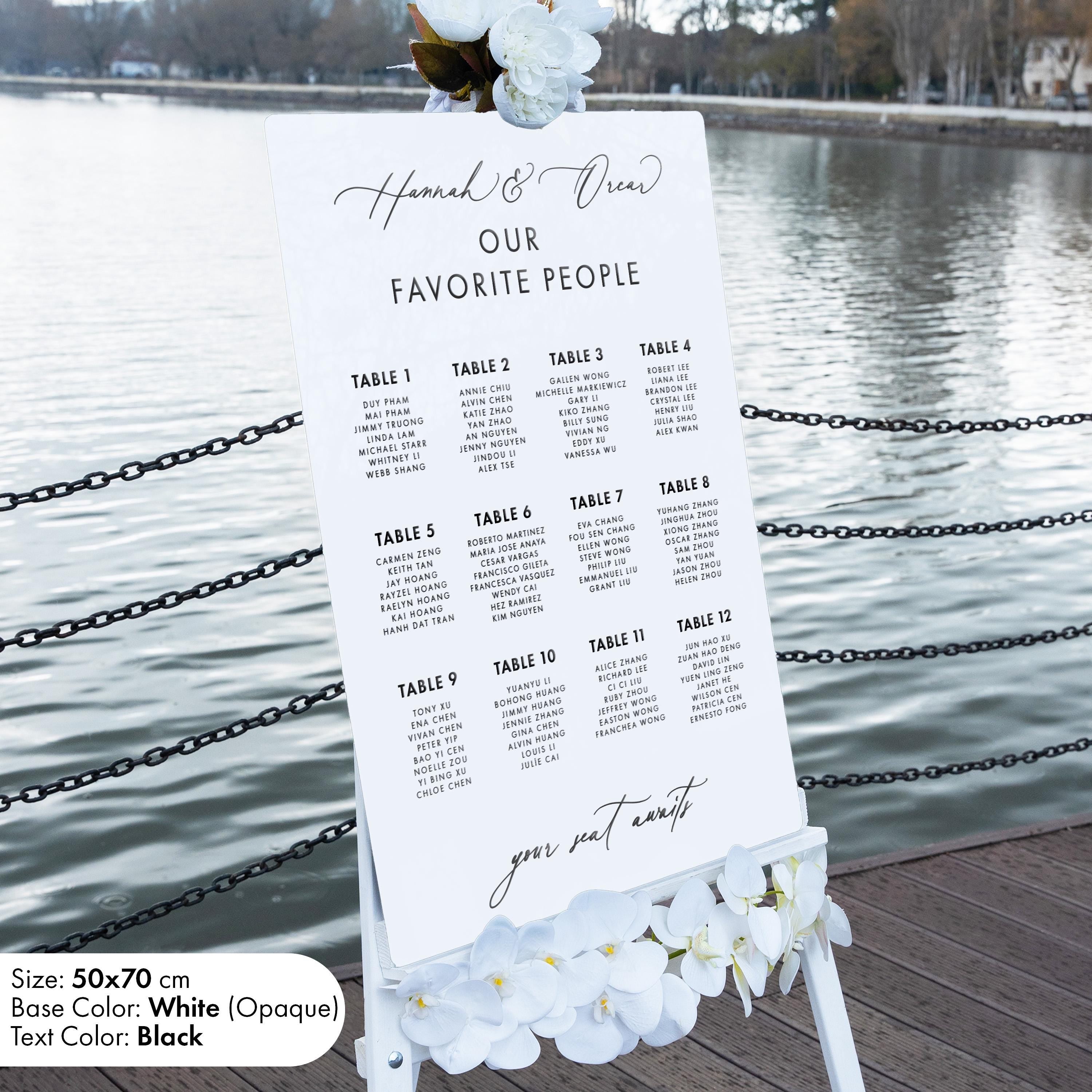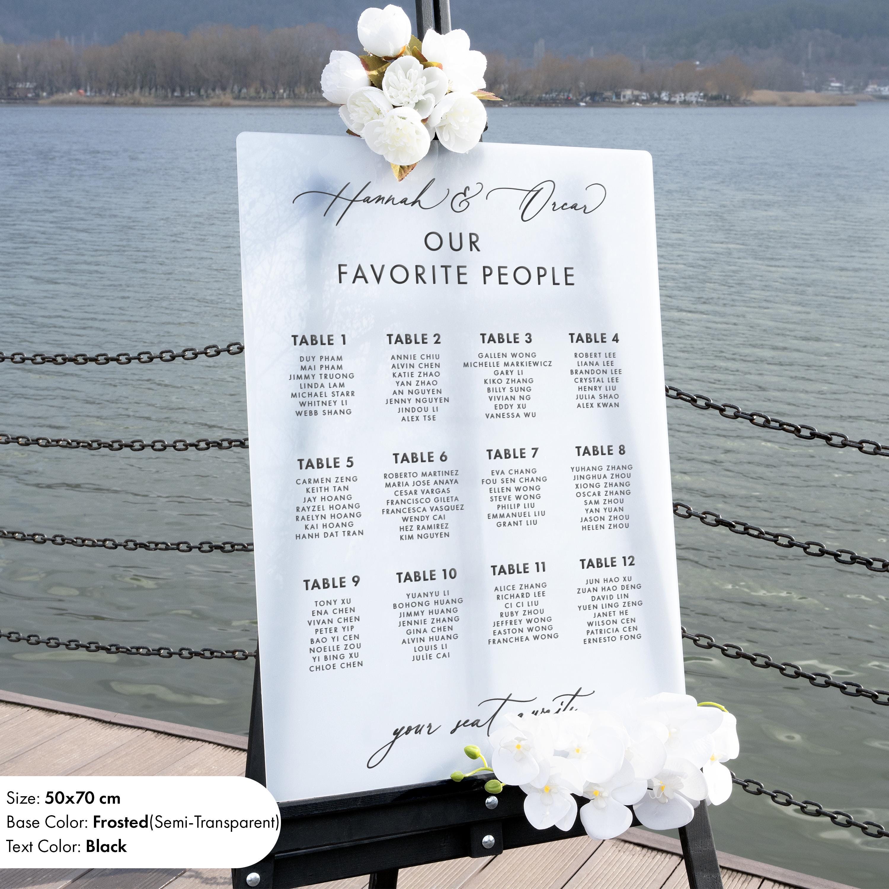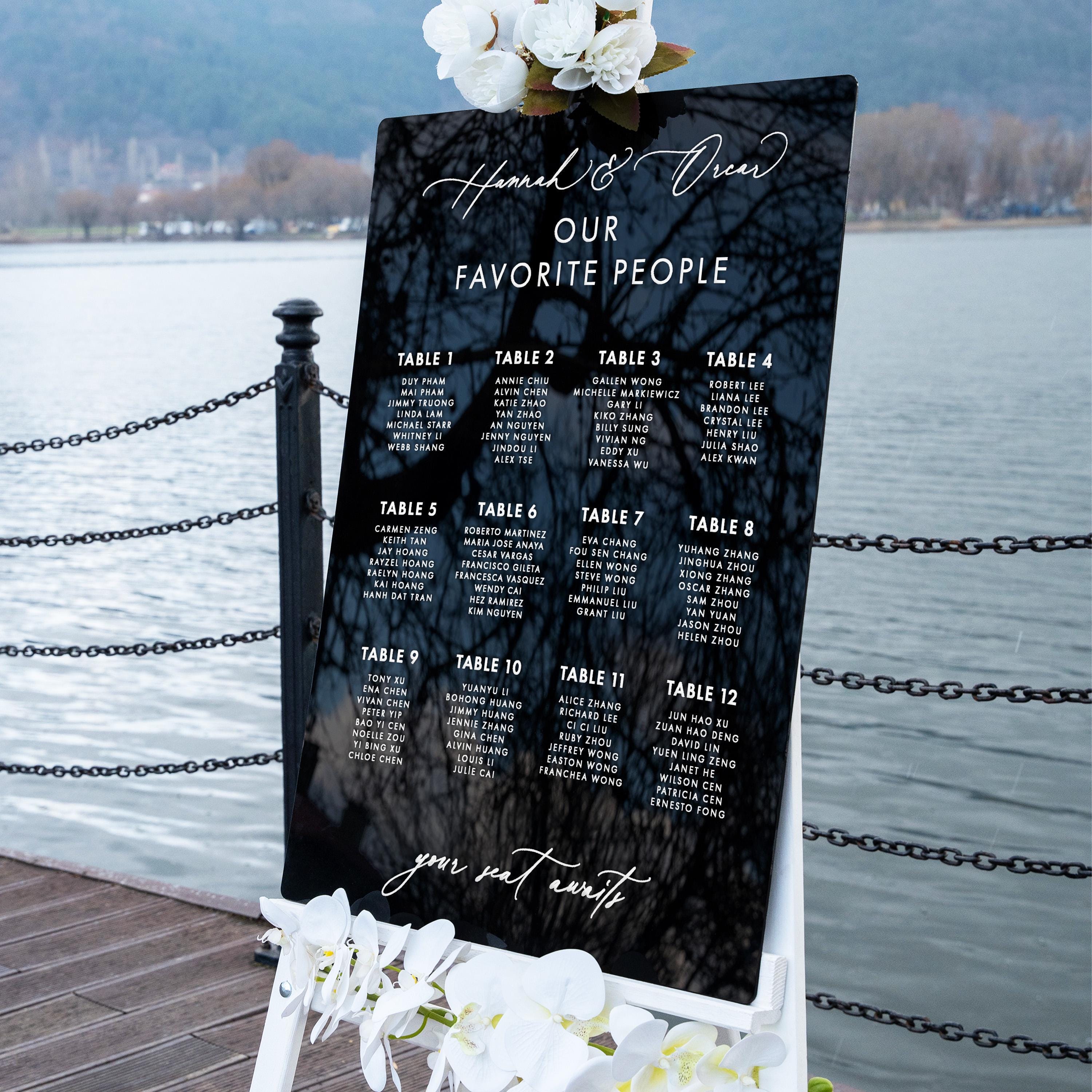 An acrylic wedding seating chart offers a clear and elegant way to guide guests to their tables, serving as both a functional seating chart sign and a decorative table plan at your wedding entrance or reception. This modern seating chart blends style with practicality, helping guests find their seats effortlessly while enhancing the overall decor.