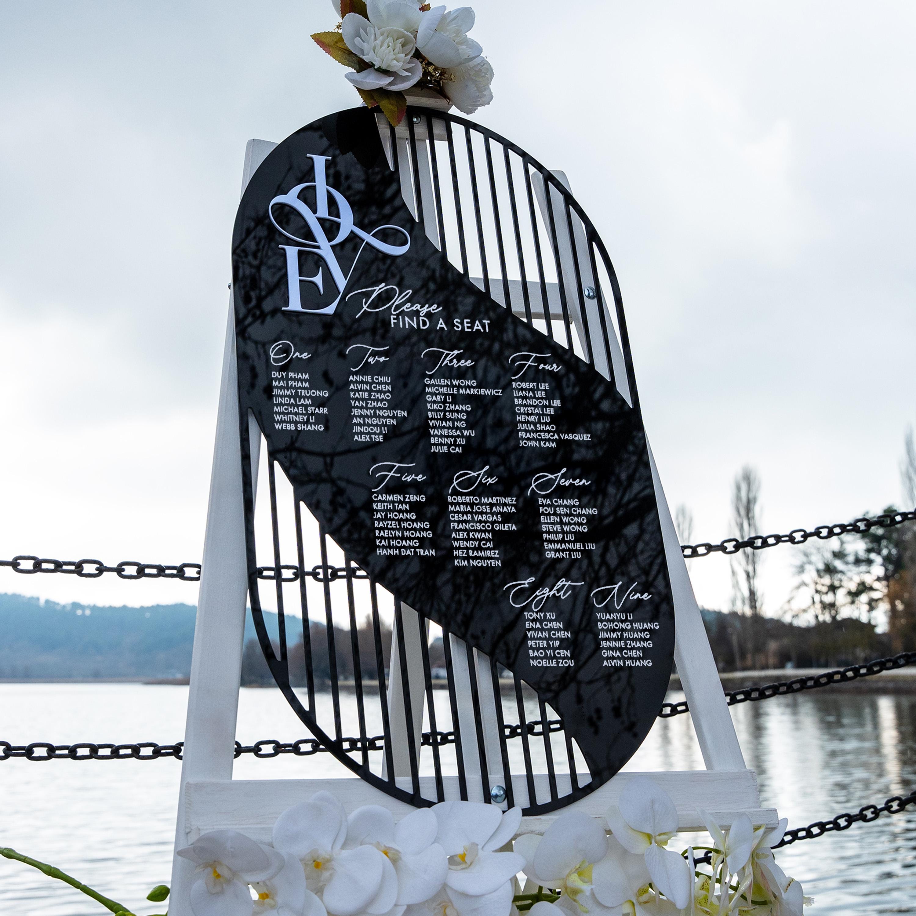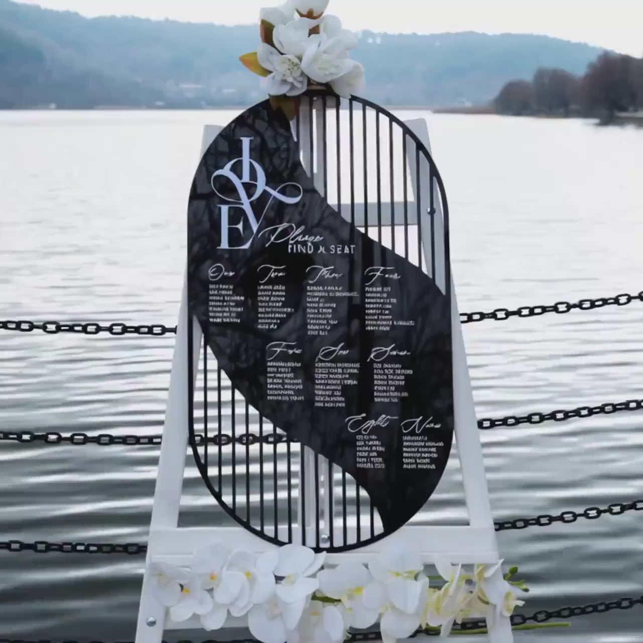 This acrylic wedding sign serves as a clear and elegant wedding seating chart that guides guests to their tables with ease. Designed as a seating chart sign, it combines functional use at the wedding entrance or reception with a decorative touch that complements any event style.