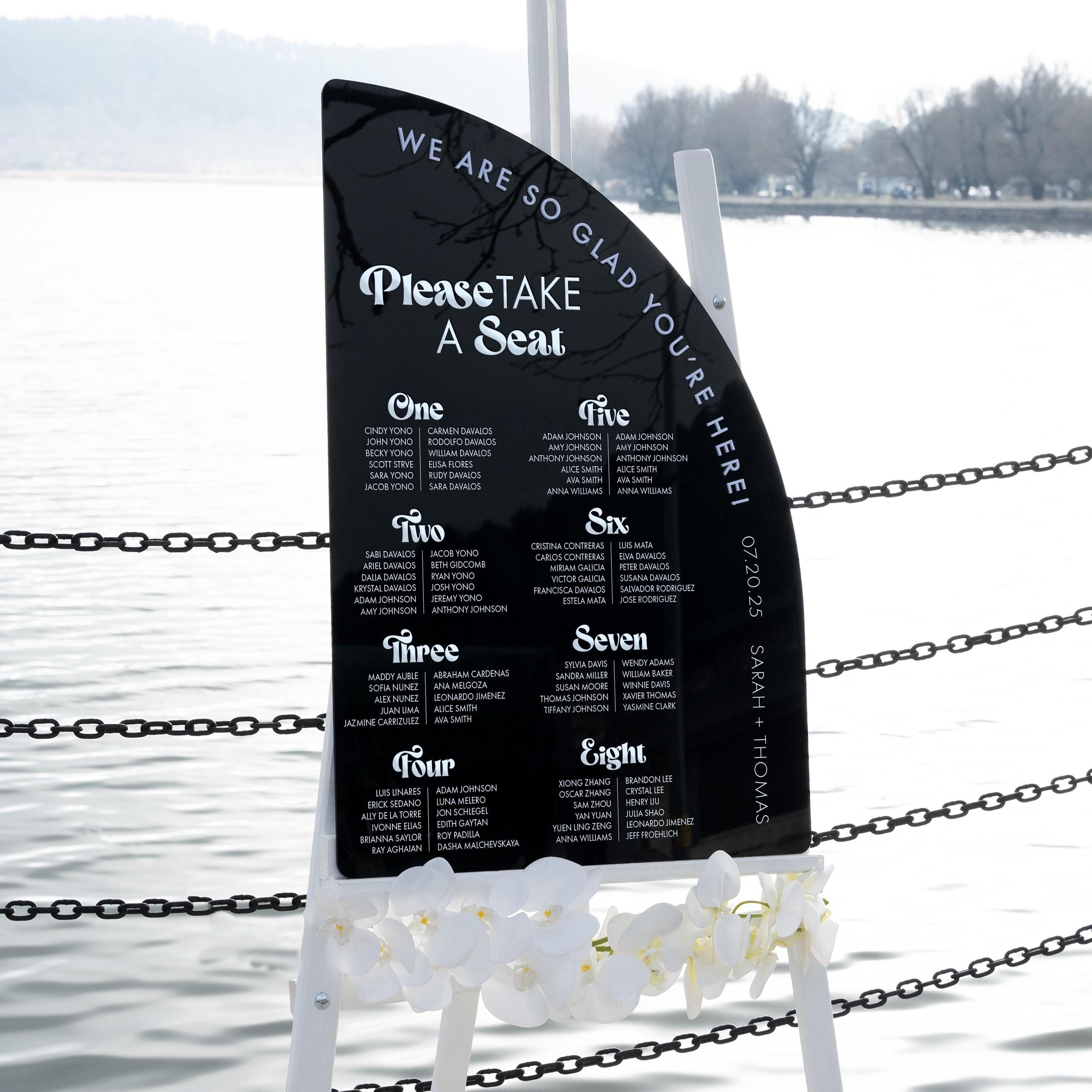 This acrylic wedding seating chart serves as a clear and elegant seating chart sign that guides guests to their tables with ease. Designed for use at the wedding entrance or reception, this table plan combines functional clarity with decorative appeal to enhance your event’s atmosphere.