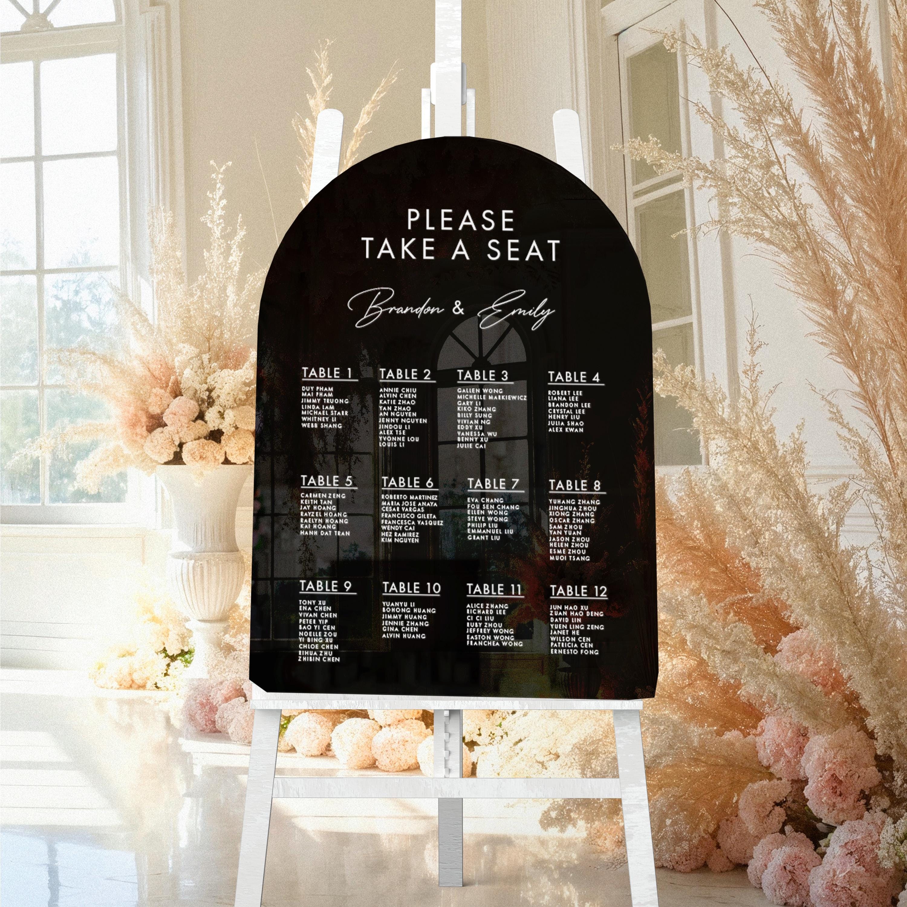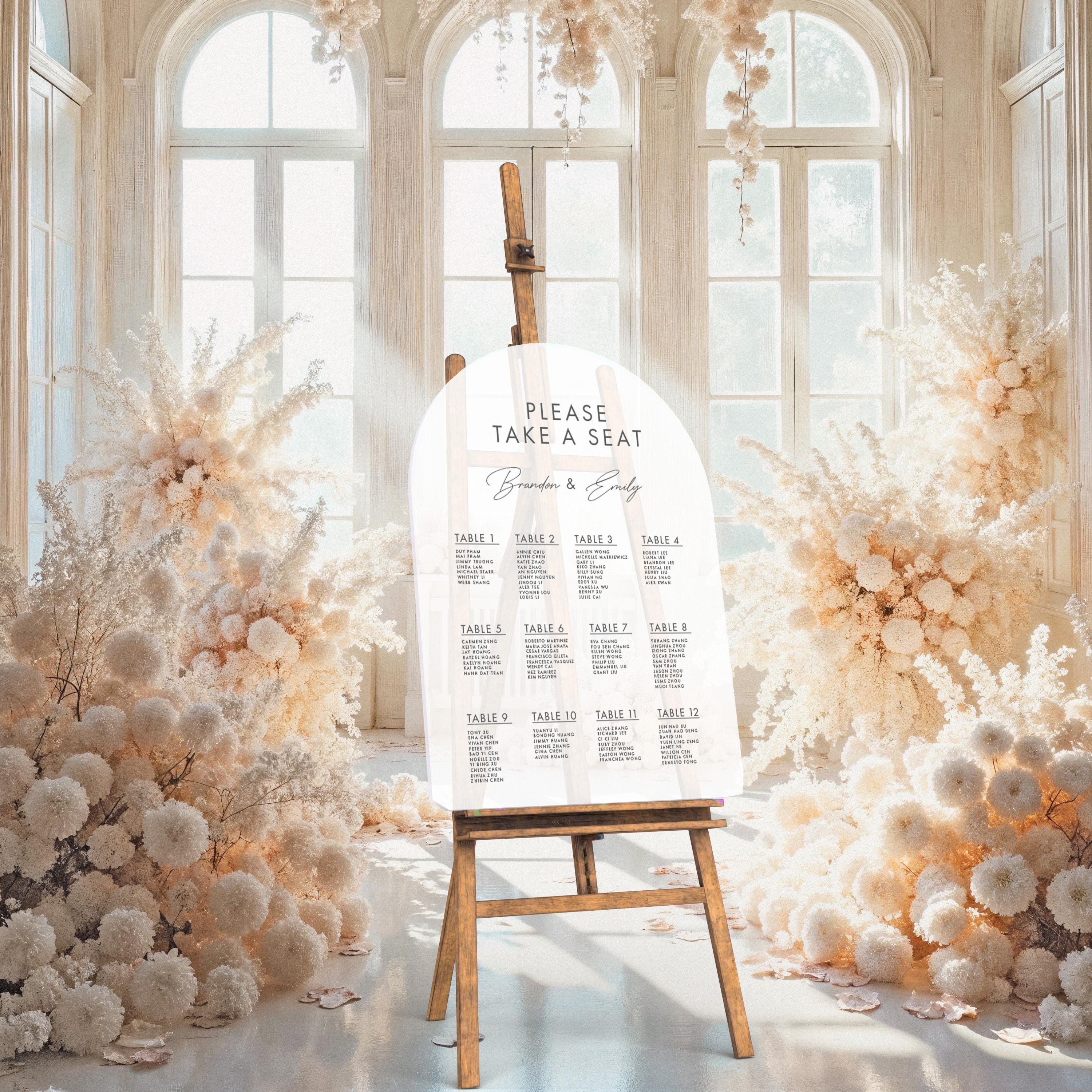 This acrylic wedding seating chart serves as an elegant seating chart sign that guides guests to their tables with ease. Designed to be displayed at the wedding entrance or reception, this table plan combines functional clarity with decorative appeal, enhancing your event’s organization and style.