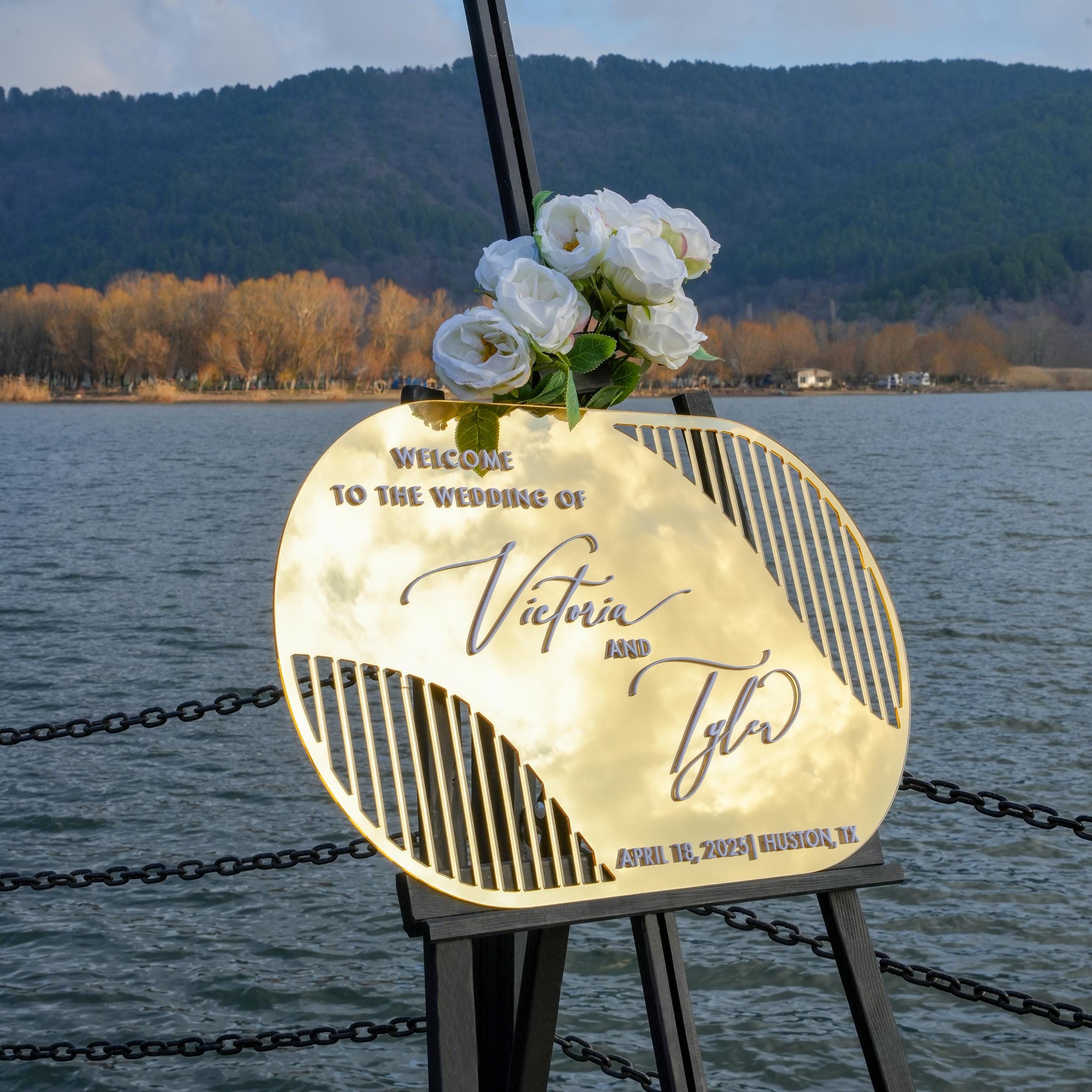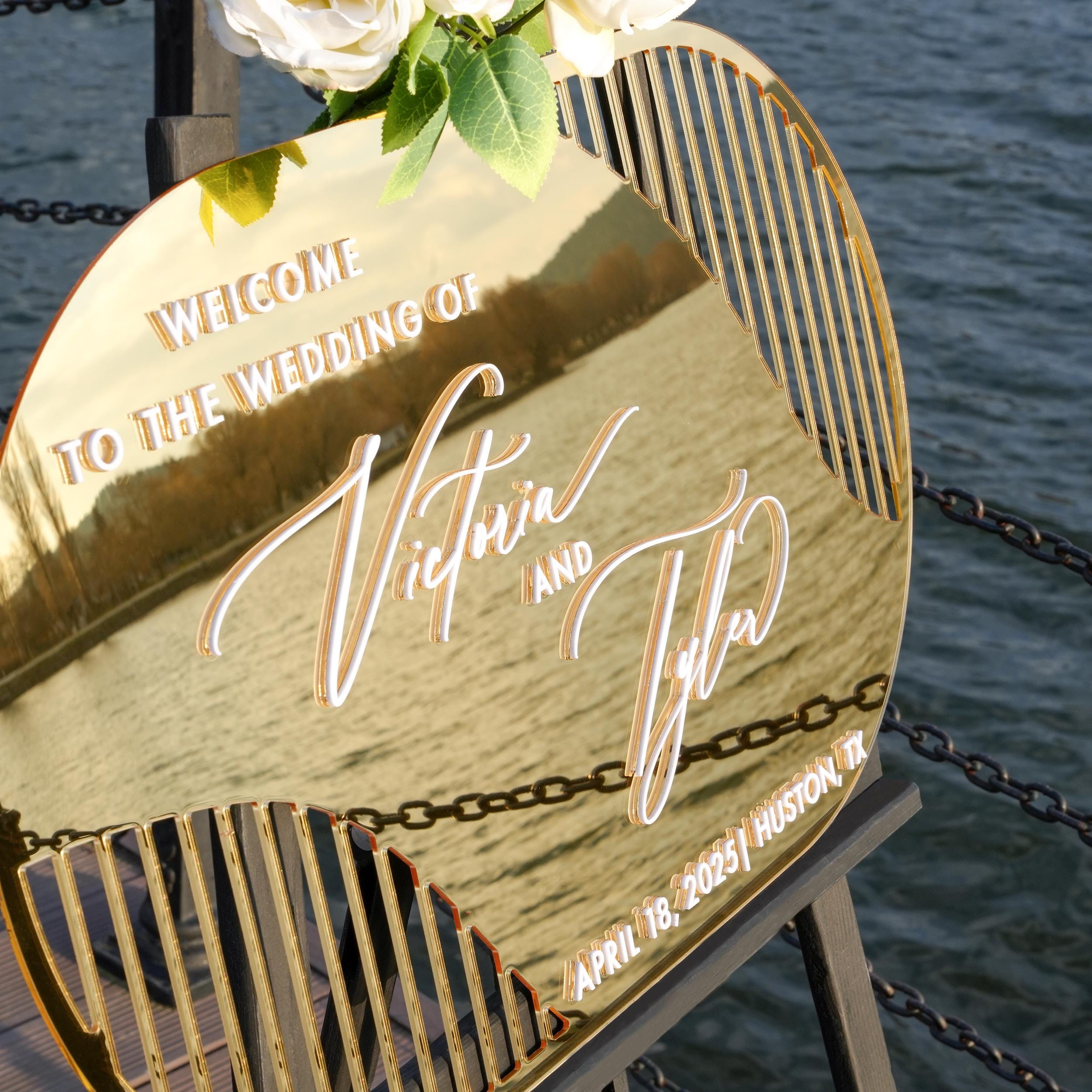 The Arch Gold Acrylic Wedding Welcome Sign from the Pansy Collection is a stunning acrylic wedding sign designed to create a warm and elegant reception entrance sign that guests will admire on your special day.