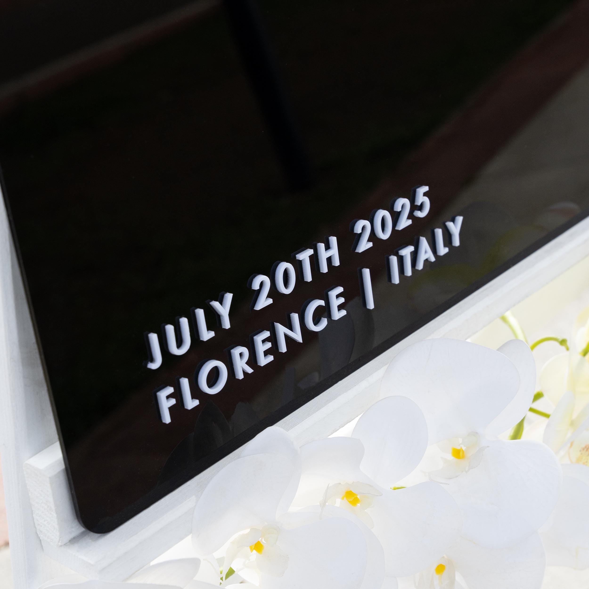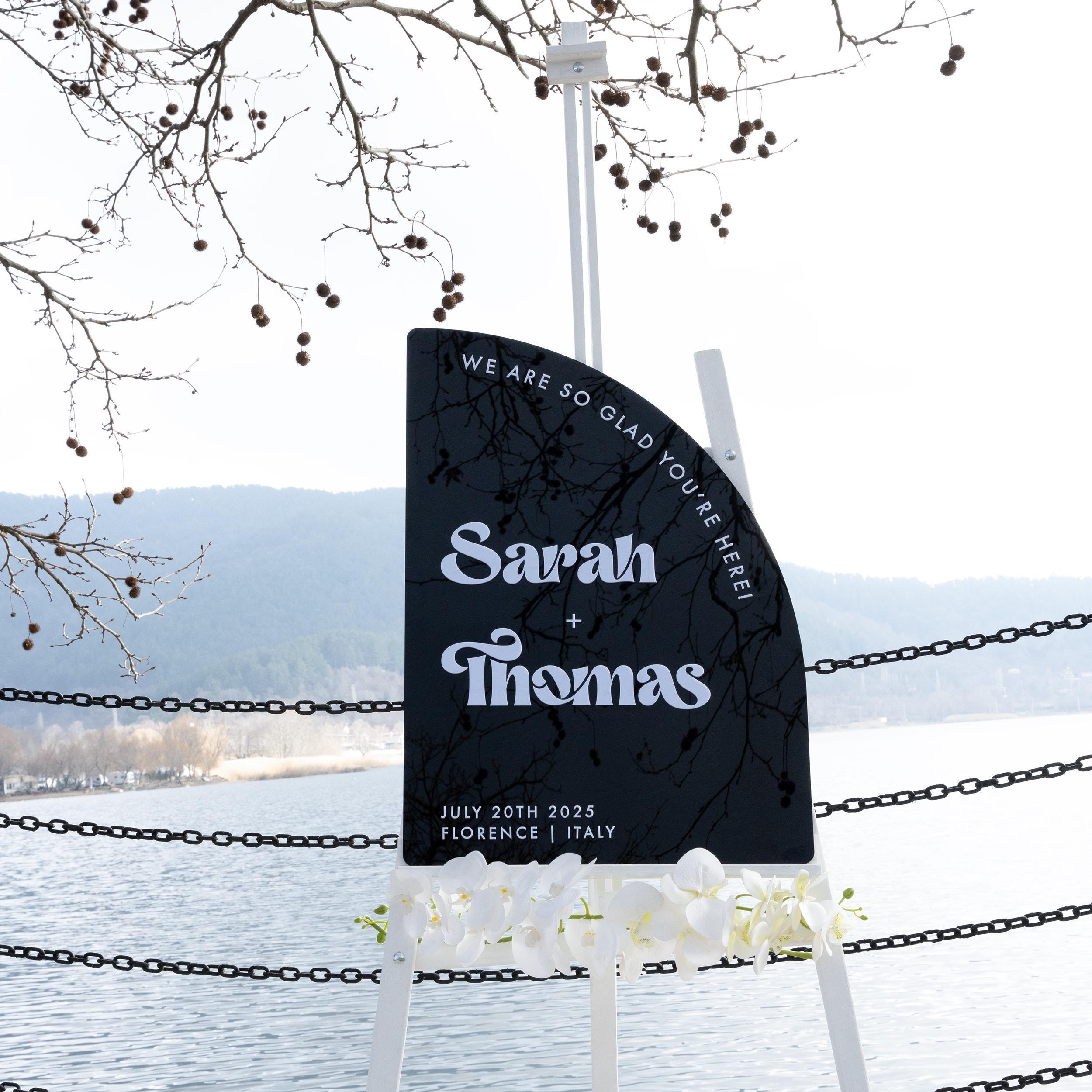 The Personalized Black Acrylic Wedding Sign from the Jasmine Collection welcomes your guests with a sleek, modern design that sets the tone for an elegant celebration. This black acrylic wedding sign features custom 3D raised lettering that highlights your names and wedding details, creating a sophisticated entrance that impresses from the first glance.