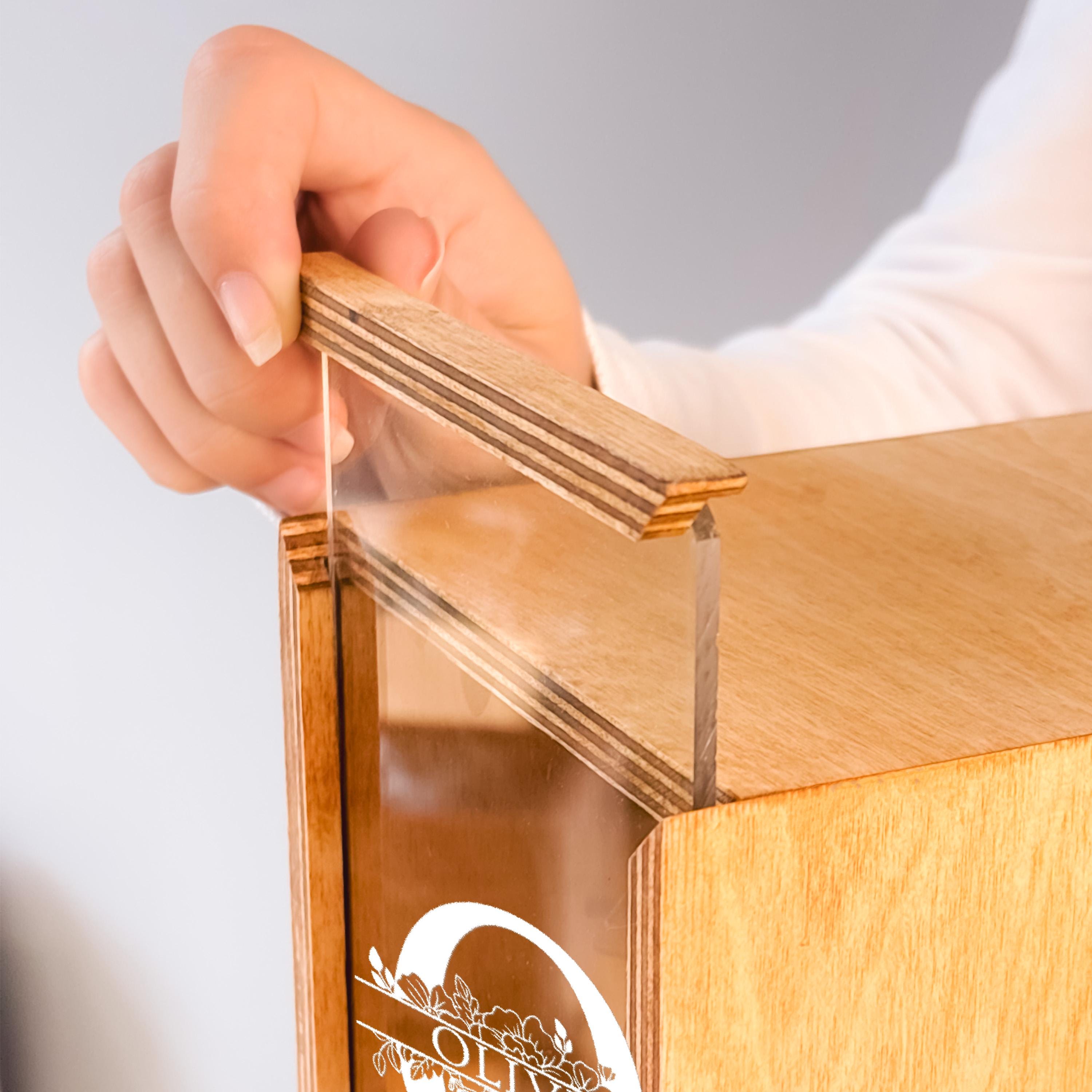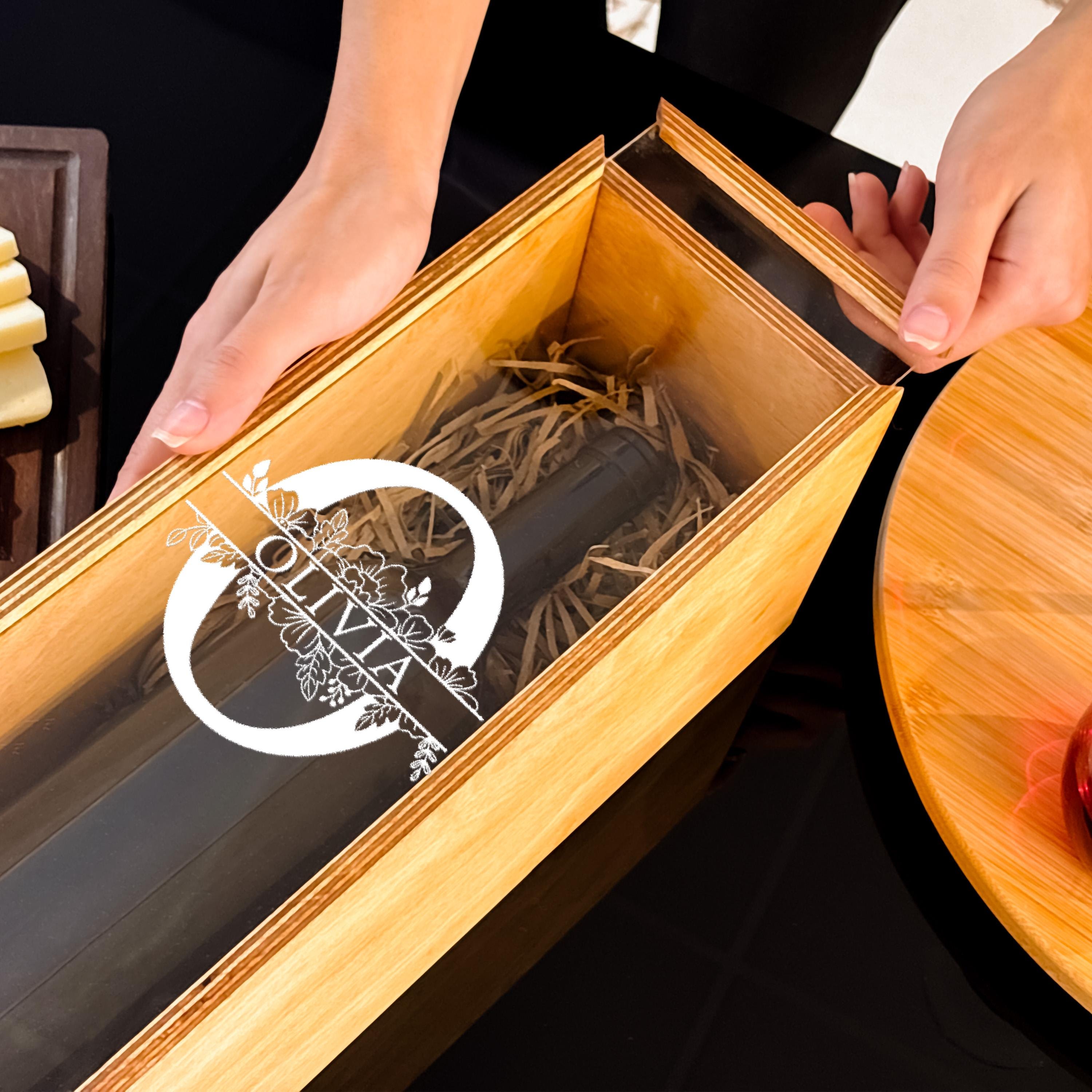 A wooden wine box crafted to elevate the presentation of your favorite bottle makes an ideal gift for weddings, housewarmings, anniversaries, or birthdays. This wine bottle holder offers a personalized touch with an engraved name or design, creating a thoughtful and elegant way to celebrate special moments. Designed to showcase the bottle beautifully, the box itself is offered without the wine, focusing on refined gifting and lasting keepsake value.