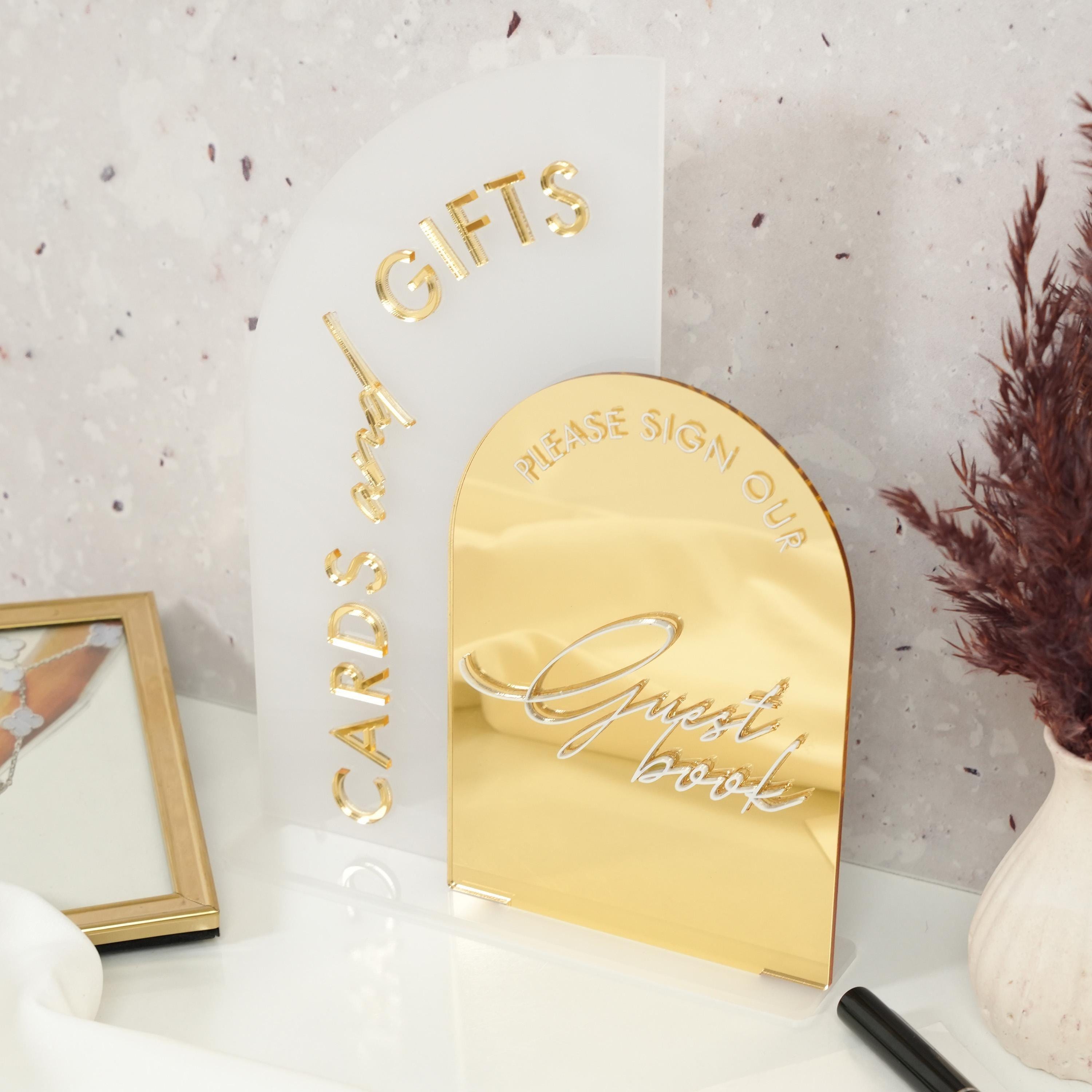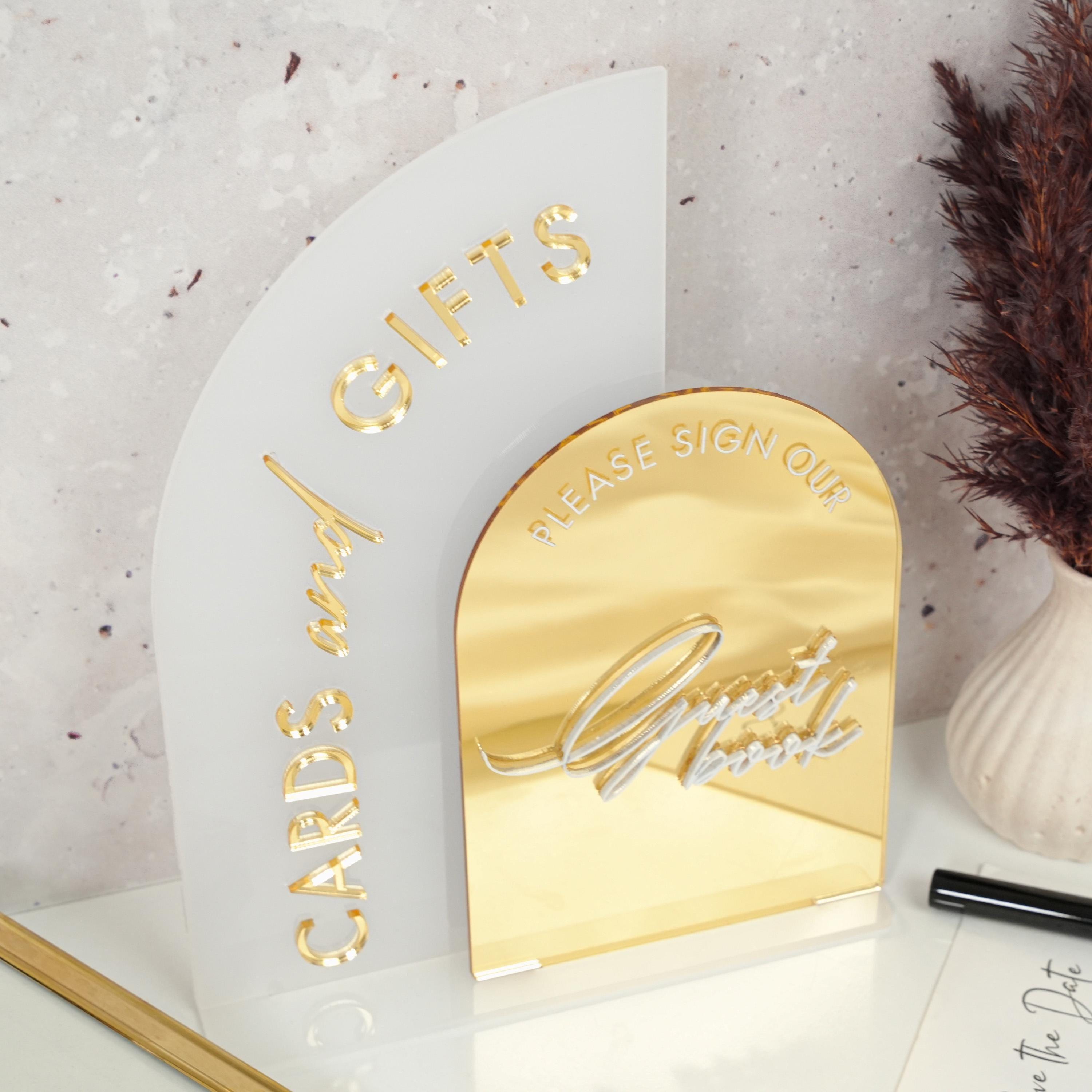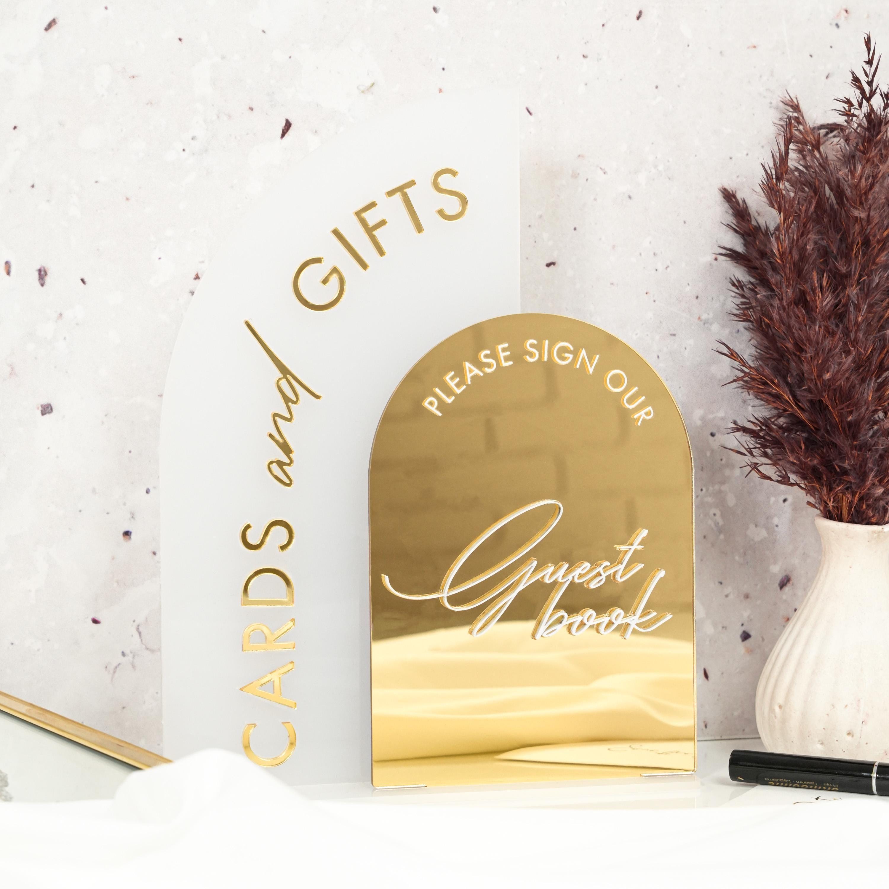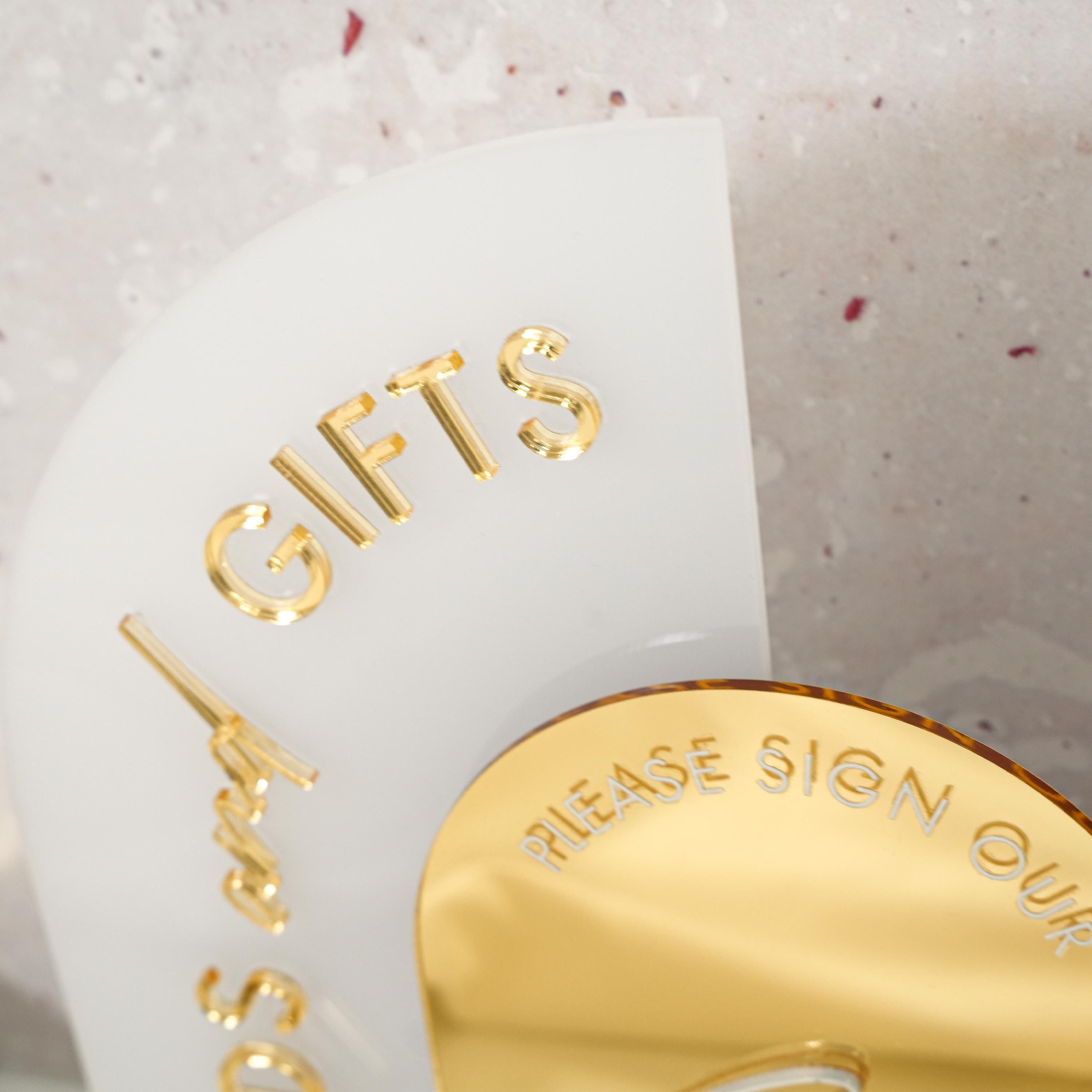 Our custom acrylic wedding sign offers a refined and elegant way to direct guests to the cards and gifts sign at your wedding or engagement reception, blending functional signage with a decorative accent. Perfectly designed to enhance the reception table or entrance, it ensures your gift table is clearly marked while adding a touch of modern sophistication.