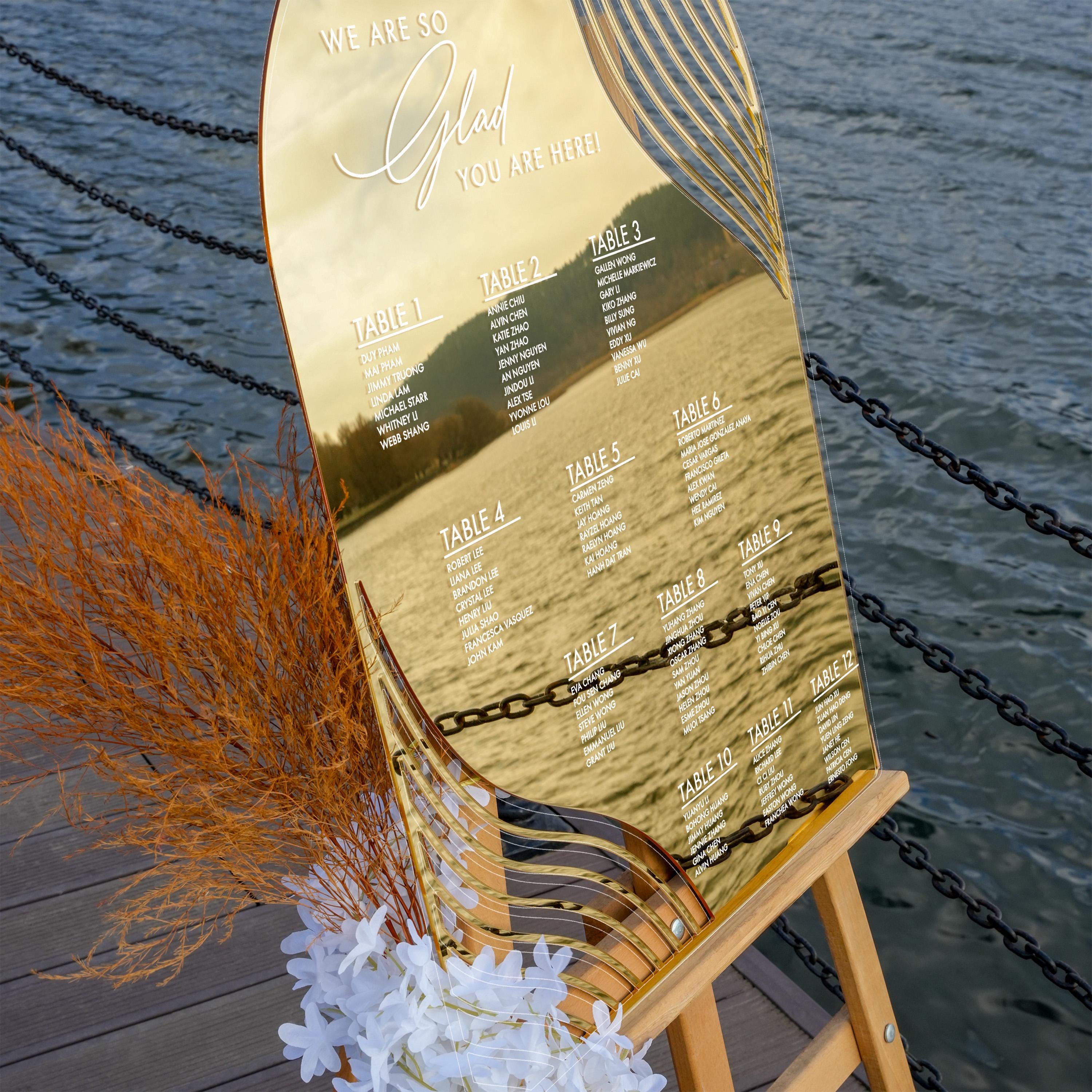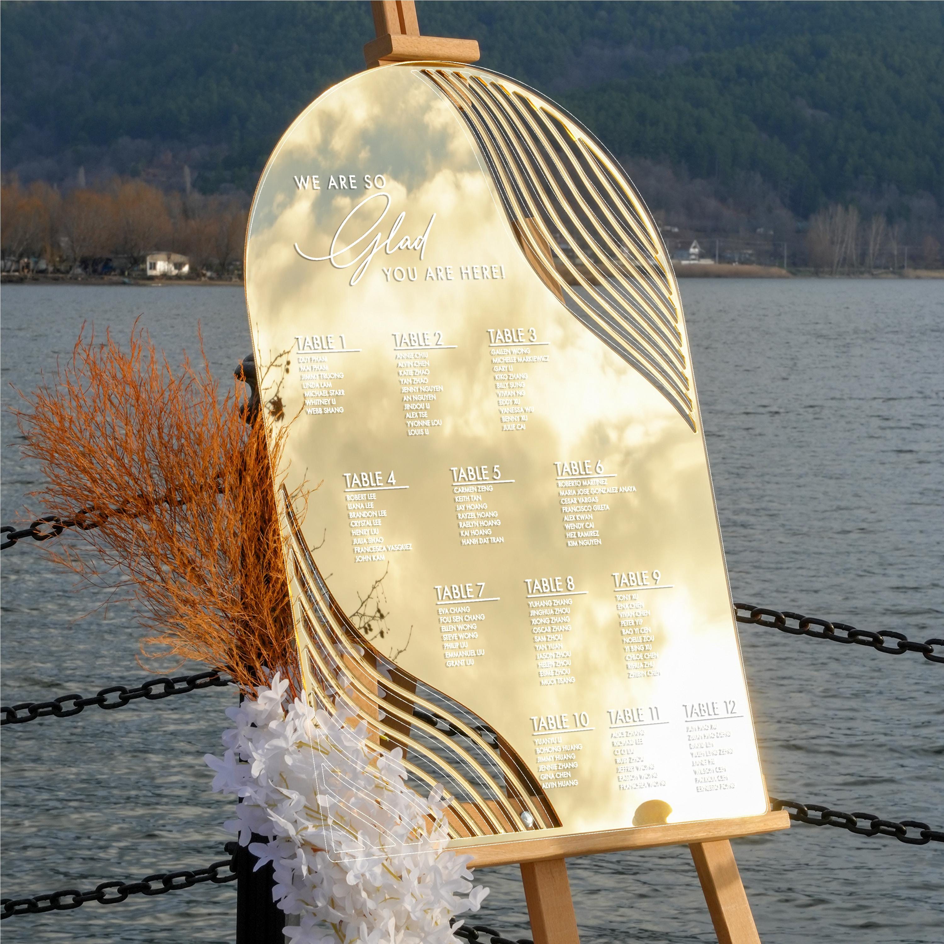The gold mirror seating chart is a stylish wedding seating chart sign that guides guests to their tables with ease. Designed for use at the wedding entrance or reception, this table plan combines functional and decorative purposes to enhance your event’s flow and elegance.