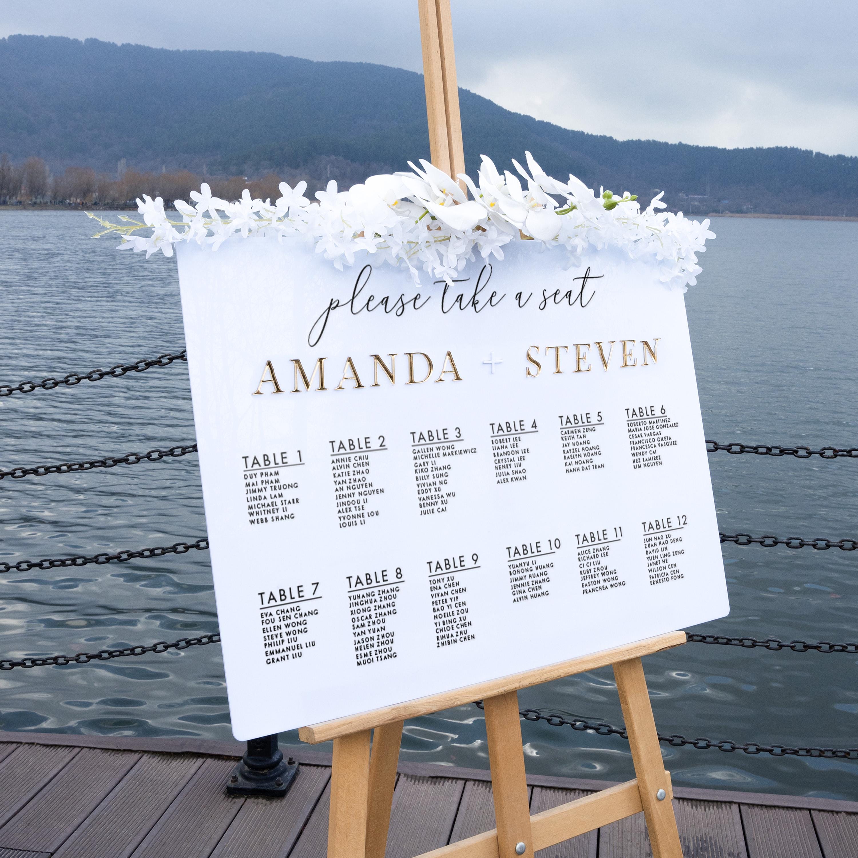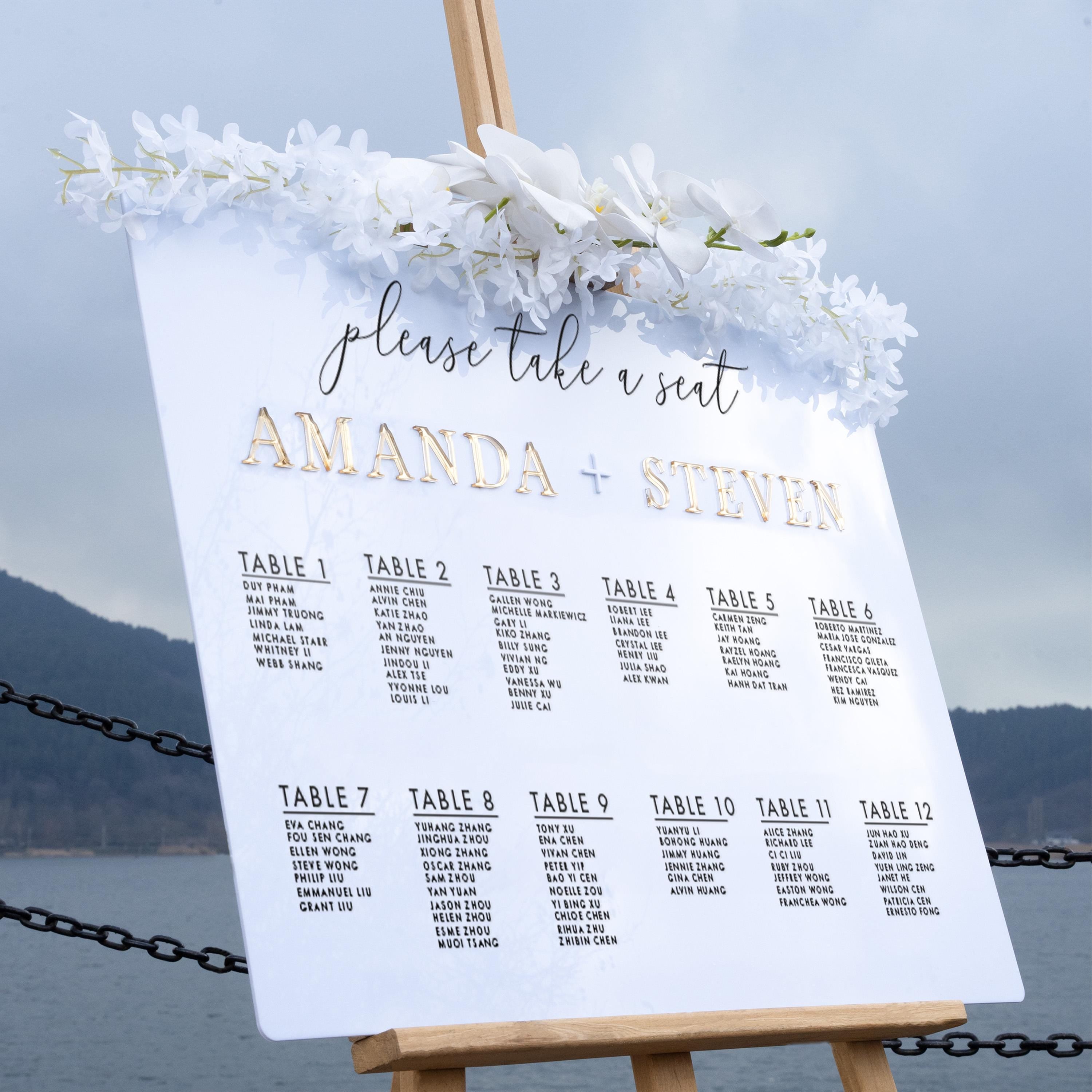 This gold mirror seating chart serves as an elegant wedding seating chart and seating chart sign that guides guests to their tables with ease. Designed for use at the wedding entrance or reception, this table plan combines functional and decorative purposes to enhance the flow and style of your event.