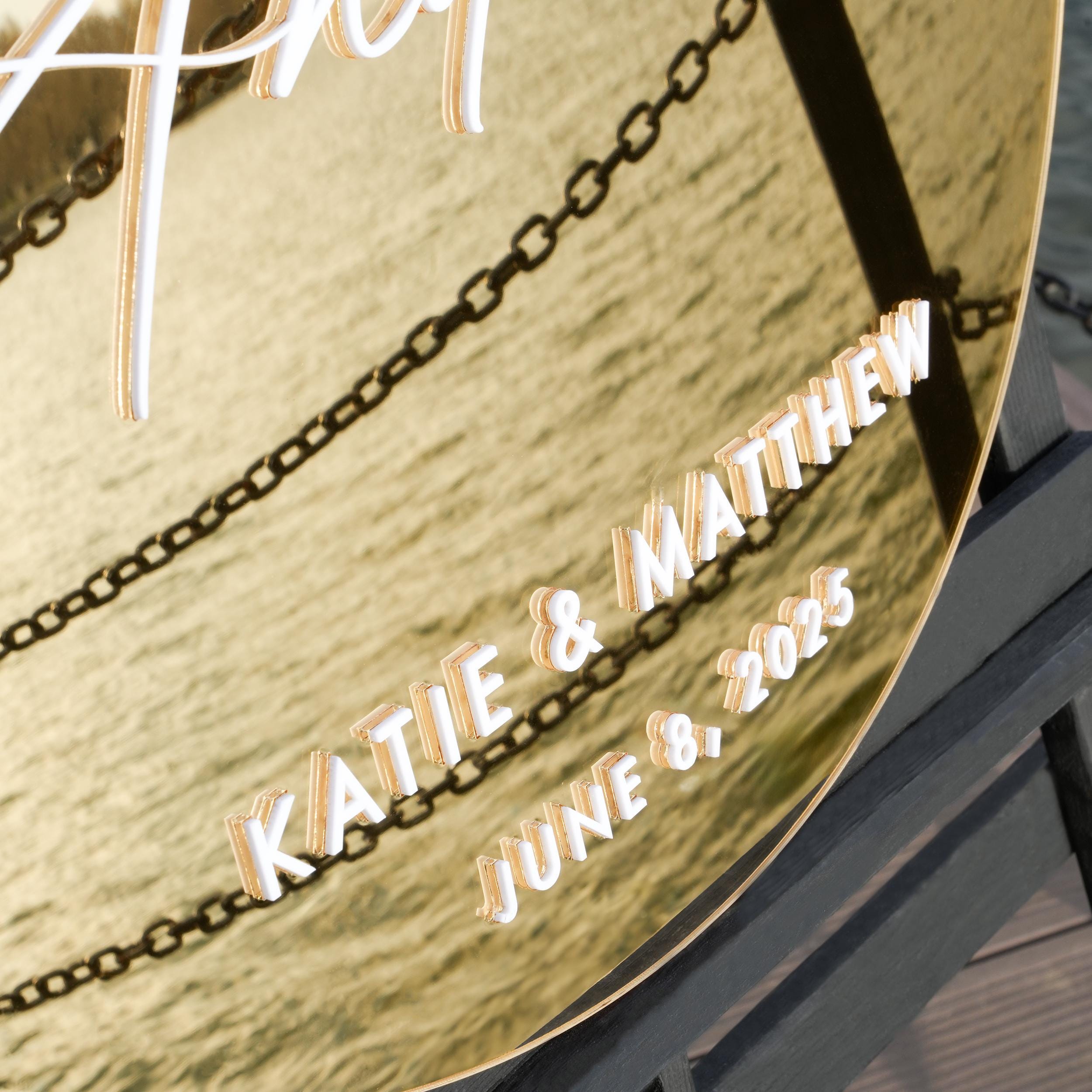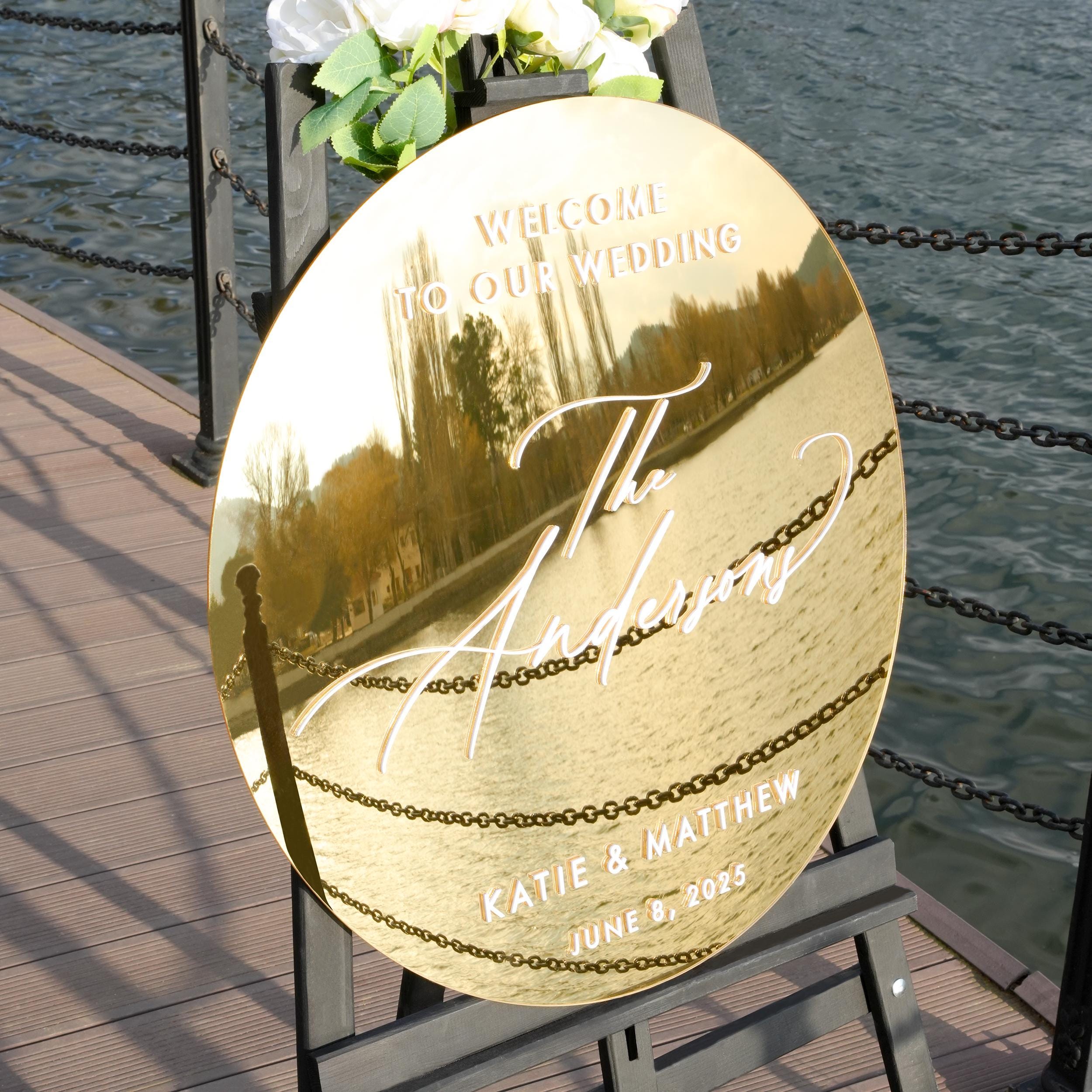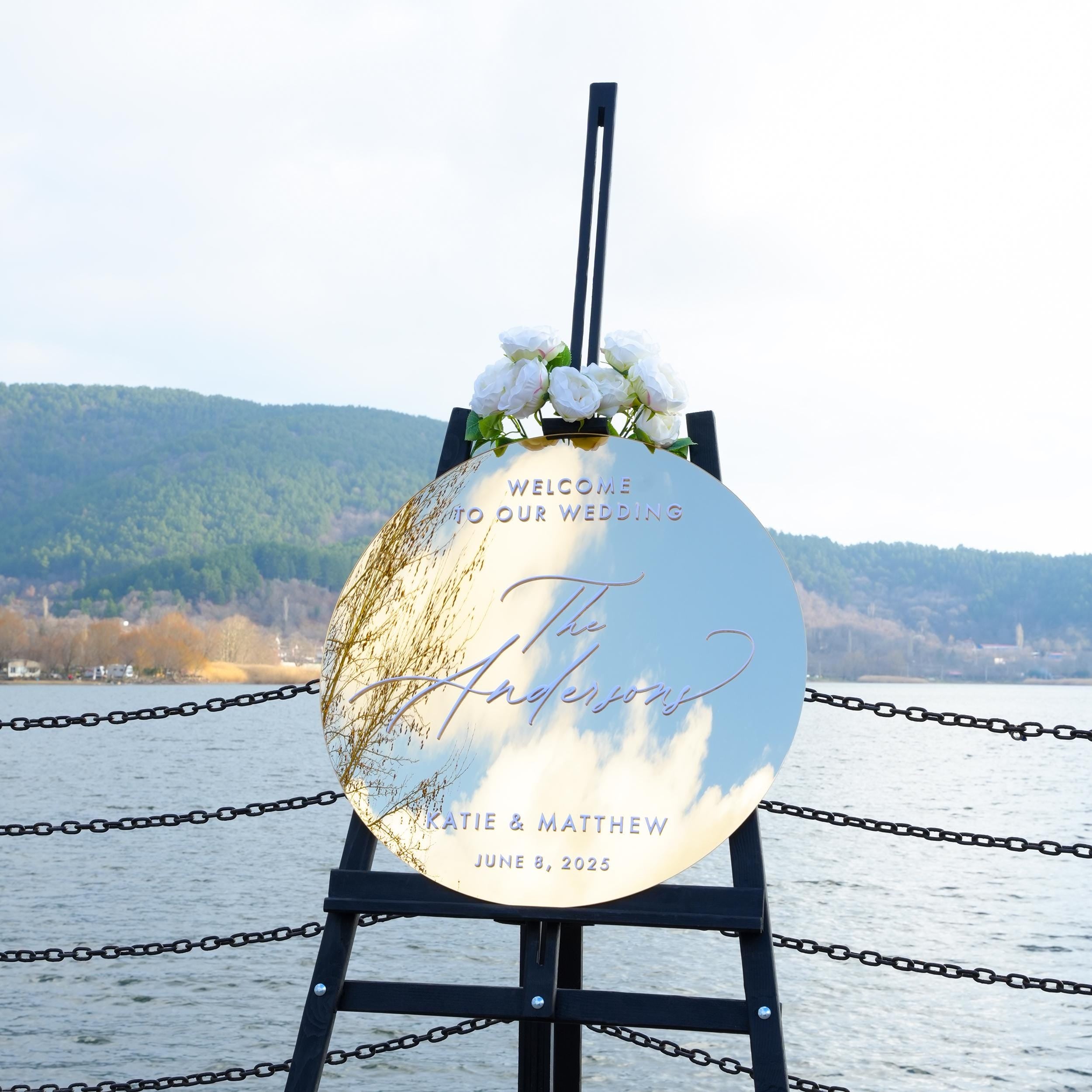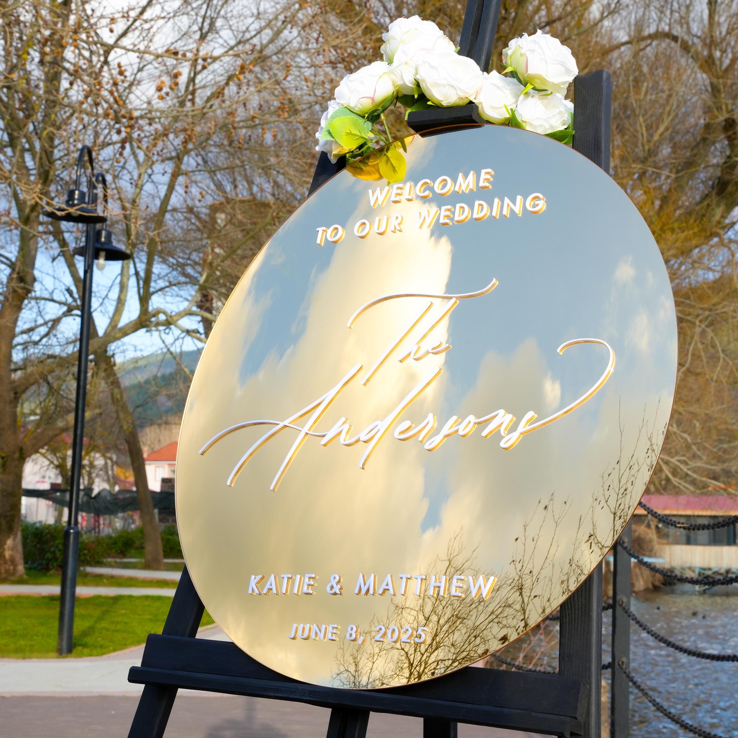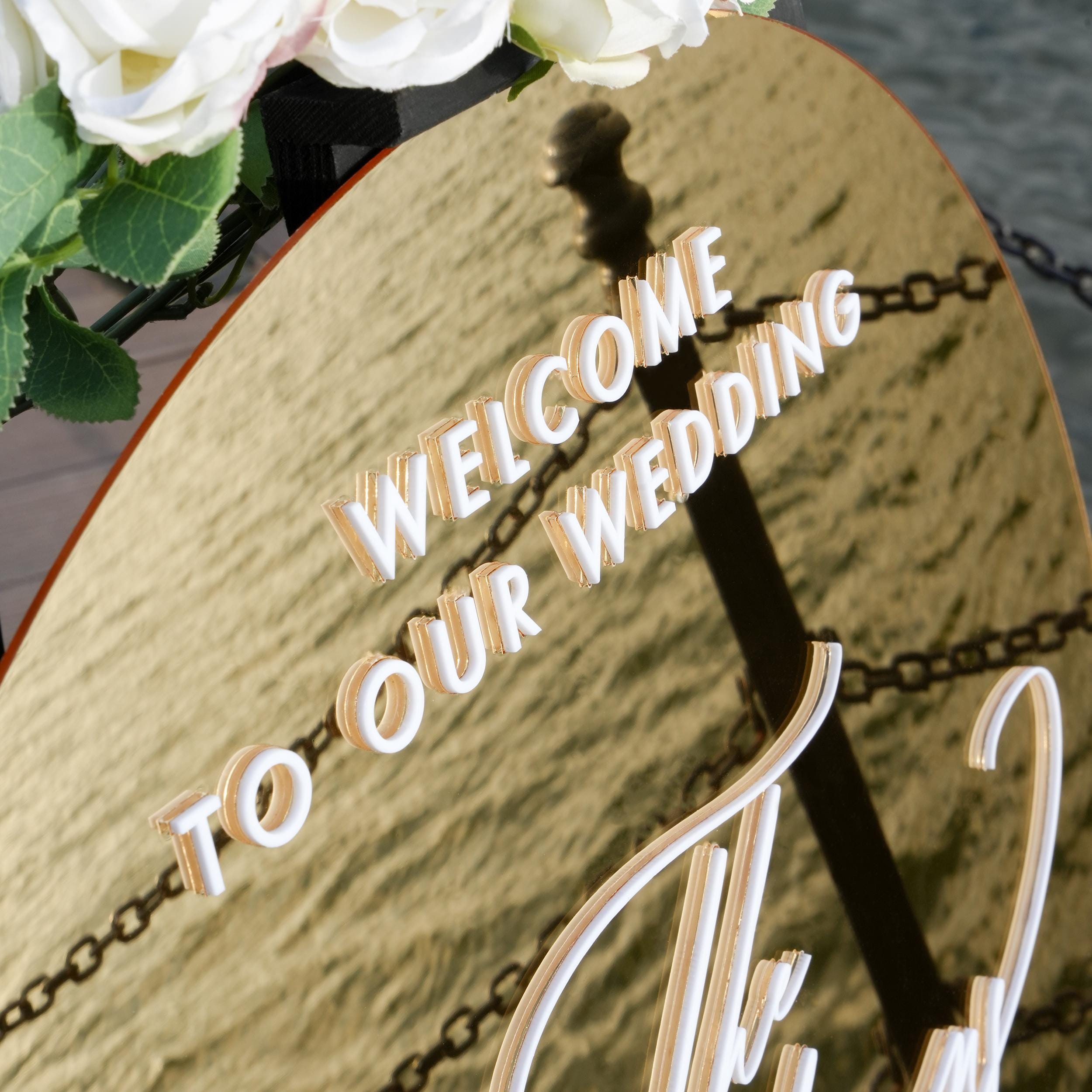 The Gold Mirror Acrylic Sign from the Daffodil Collection creates a stunning first impression at your wedding entrance, combining elegance with personalized style.