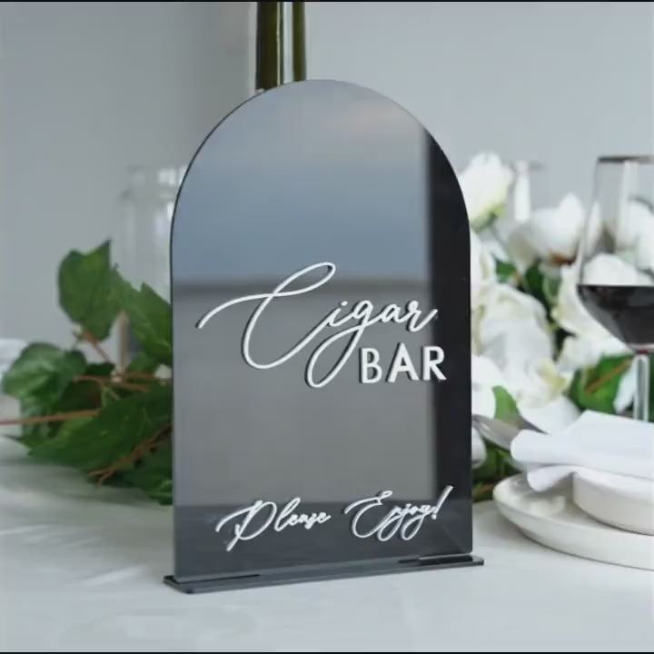 Add a touch of sophistication to your celebration with our modern Cigar Bar acrylic sign. Featuring 3D raised lettering and a sleek arched design, this sign brings bold elegance to your wedding, bachelor party, or upscale event. A perfect detail to complete your lounge or bar setup.