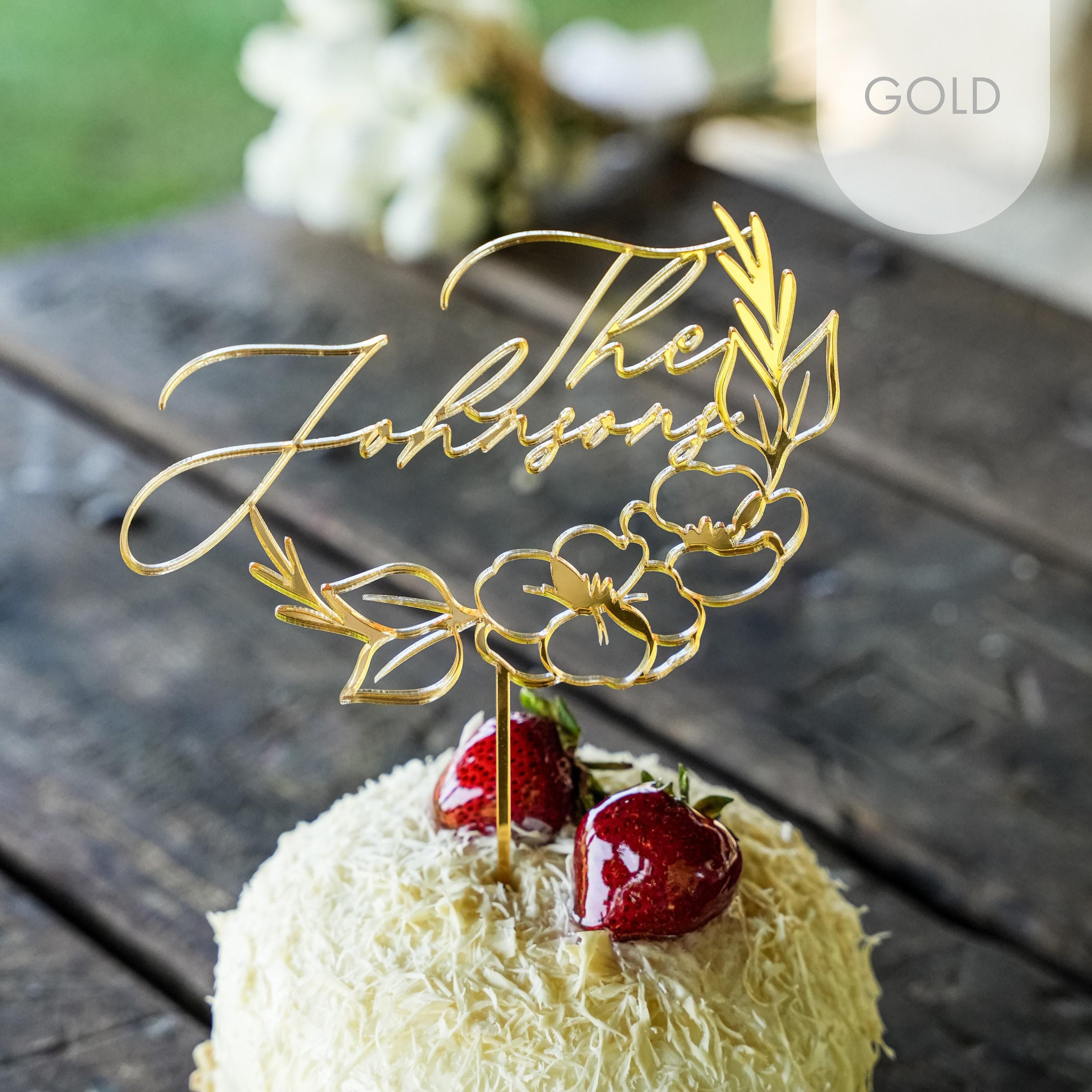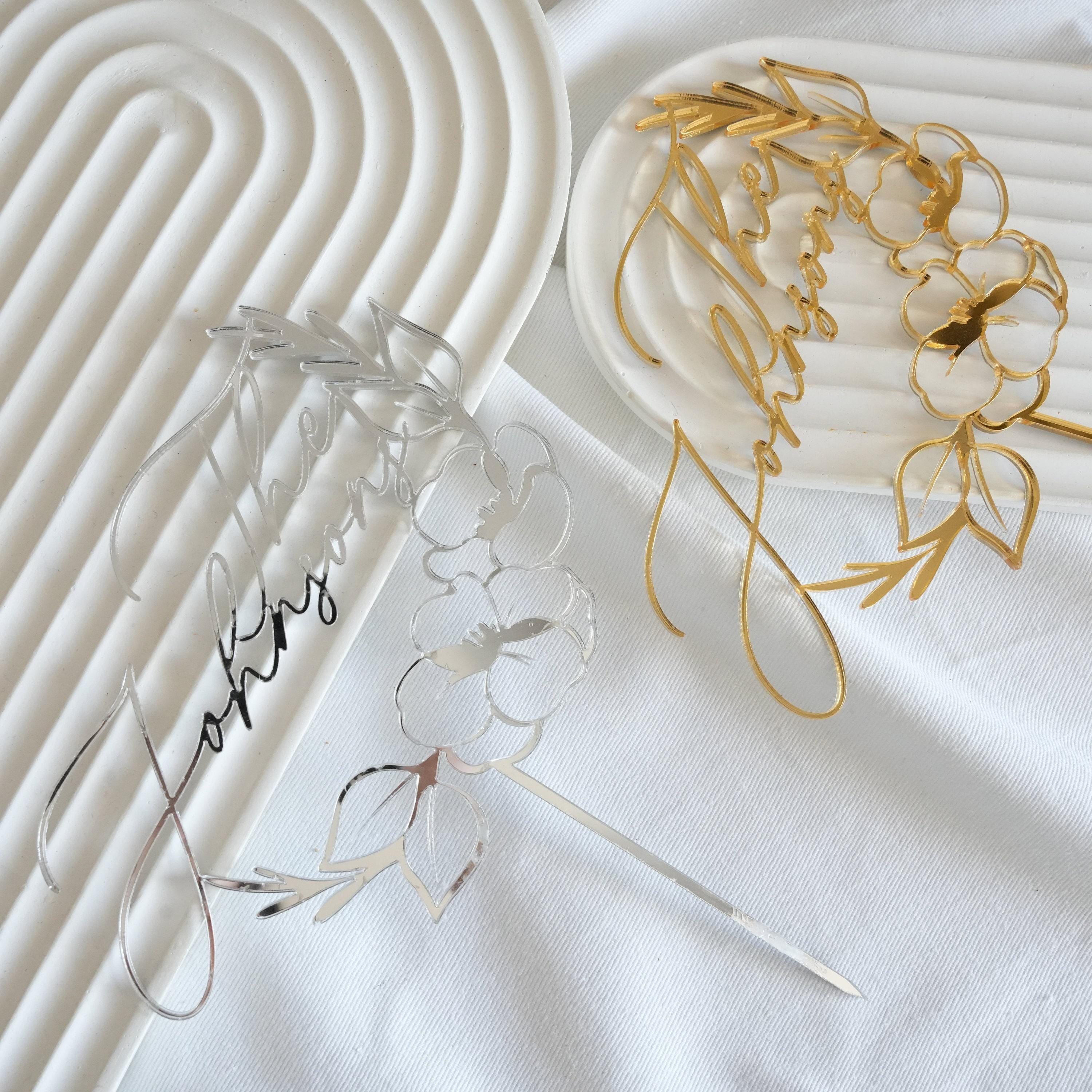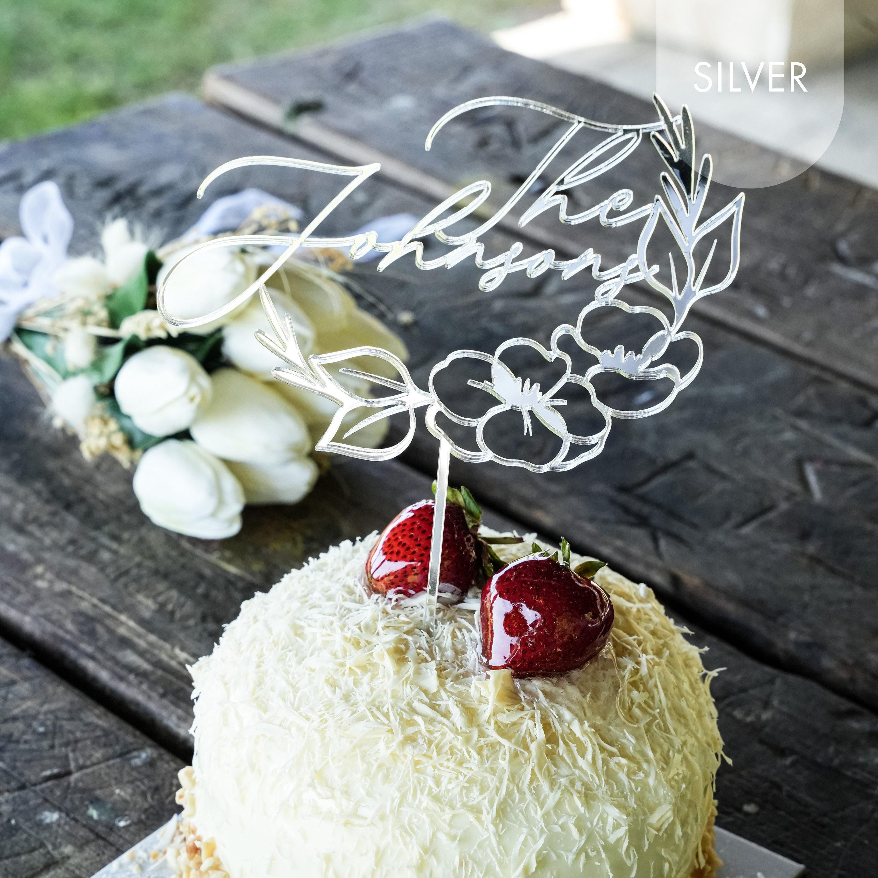The silver floral cake topper offers a personalized design that enhances wedding and engagement cakes with a delicate charm style cake decoration. This decorative cake accent transforms any celebration into an elegant affair, adding a custom touch that highlights the special moment.
