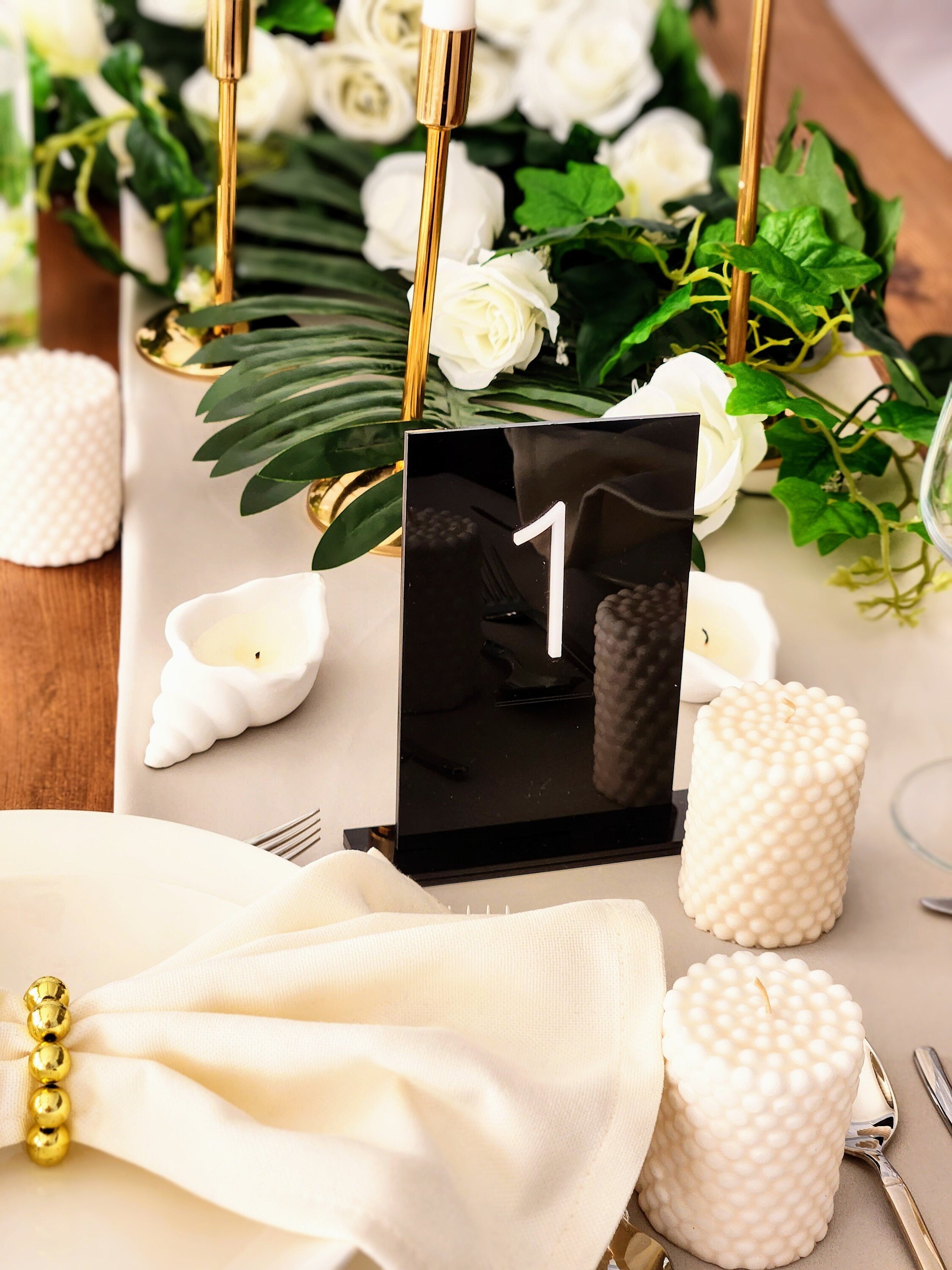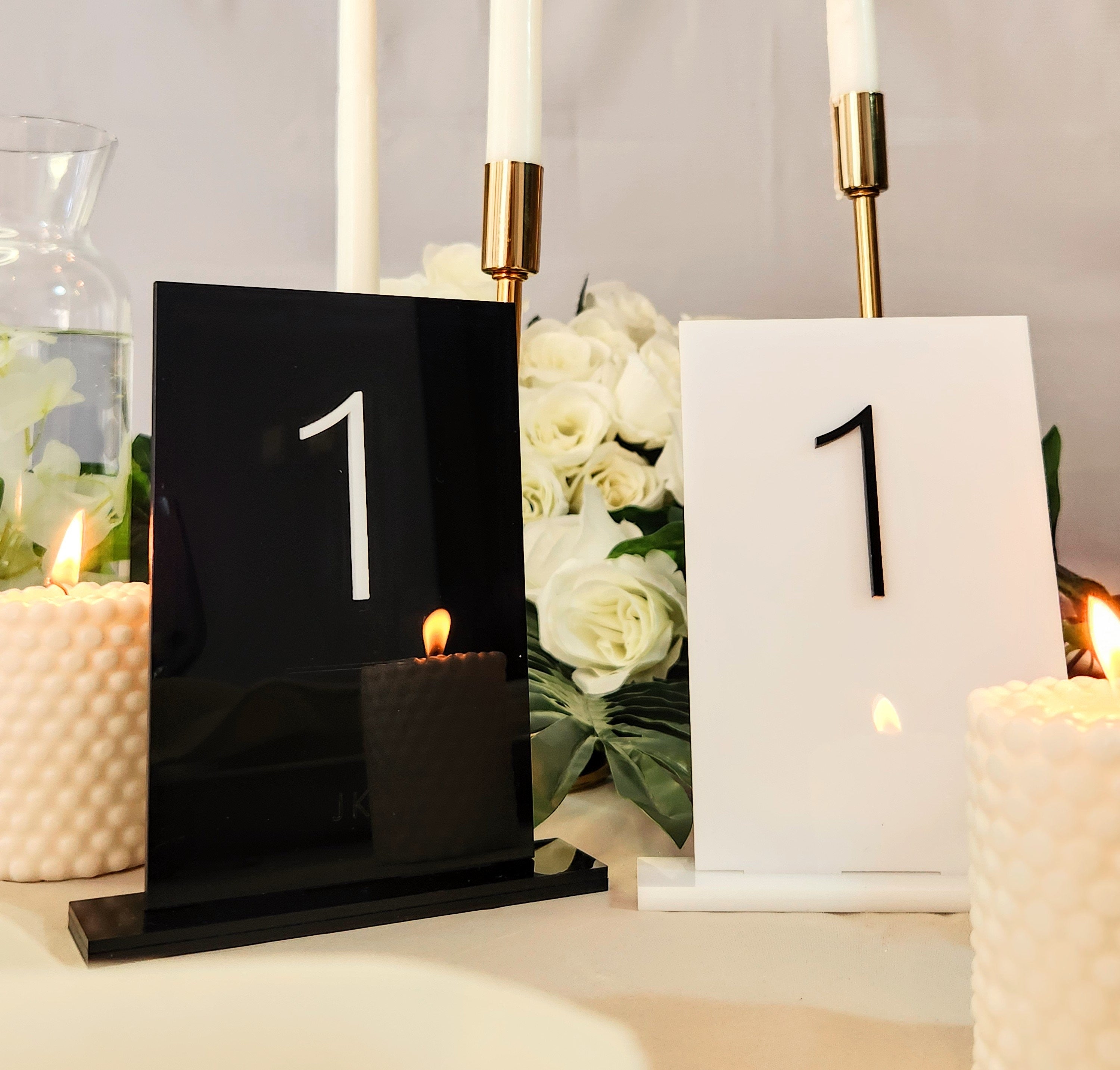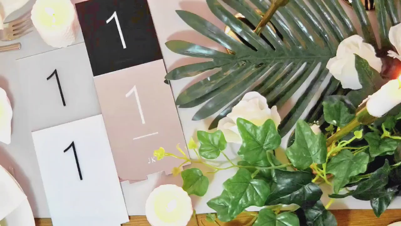 Acrylic wedding table numbers provide elegant table number signage that helps guests easily identify their seats at weddings, engagements, and rehearsal dinners. These decorative table accents combine modern style with practical function to enhance any event setting.