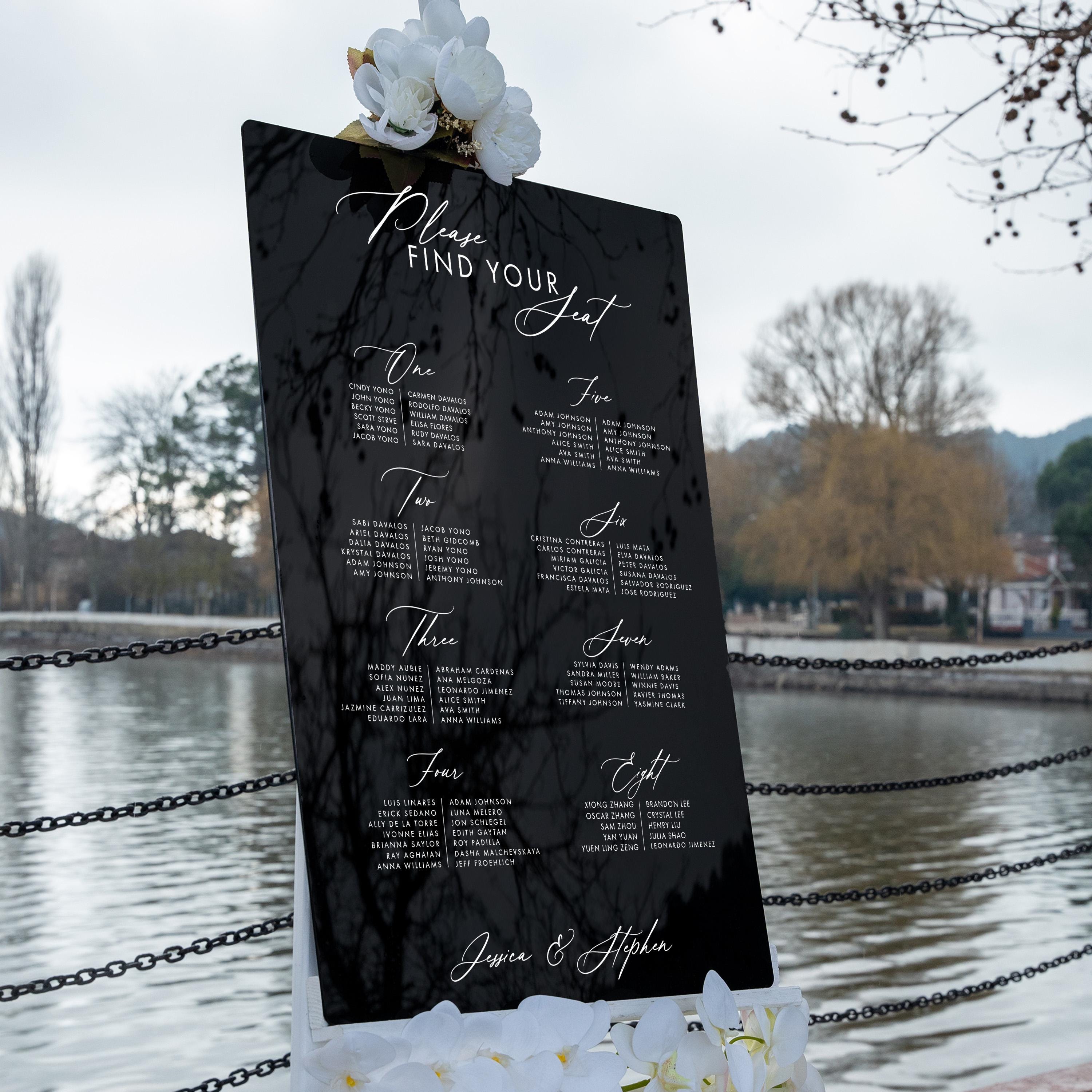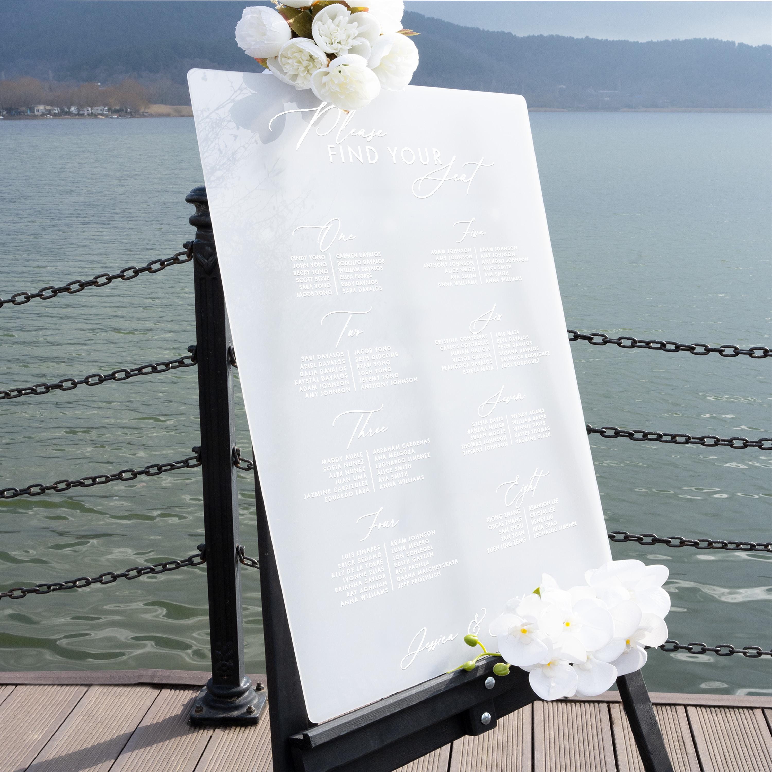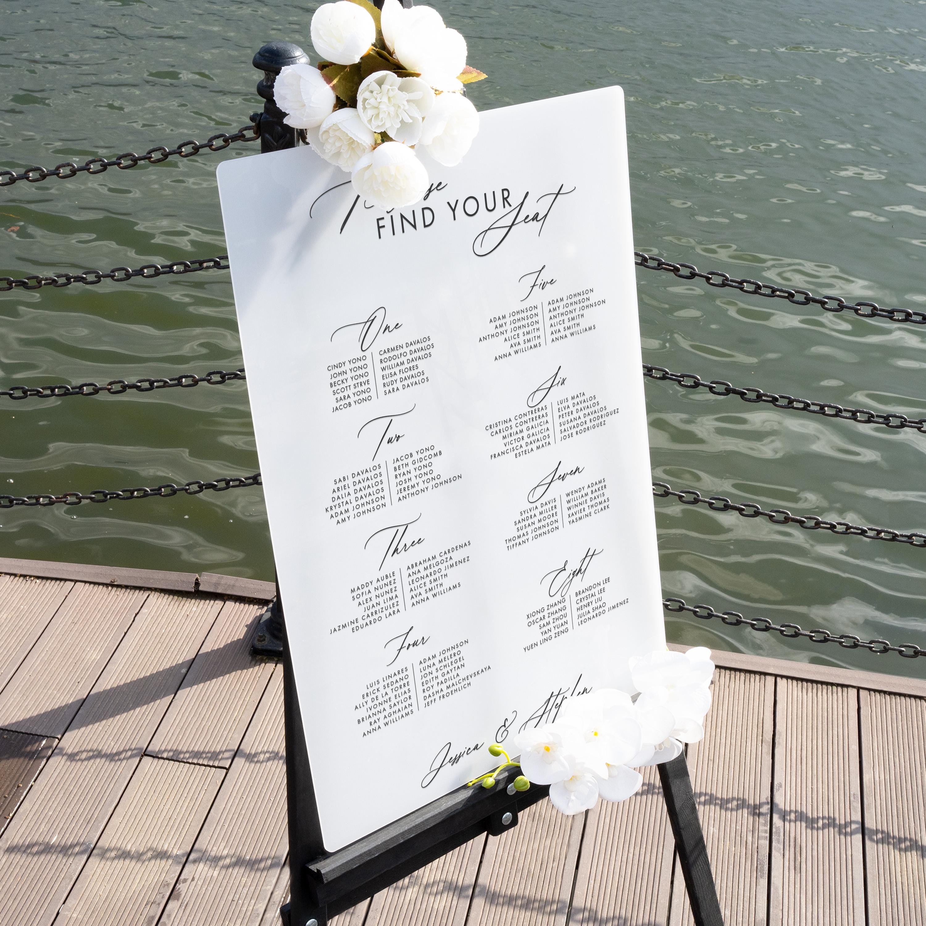 A personalized wedding seating chart serves as a clear and elegant seating chart sign that guides guests to their tables with ease, combining both functional and decorative purposes. Positioned at the wedding entrance or reception, this table plan enhances the flow of your event while adding a refined touch to your décor.