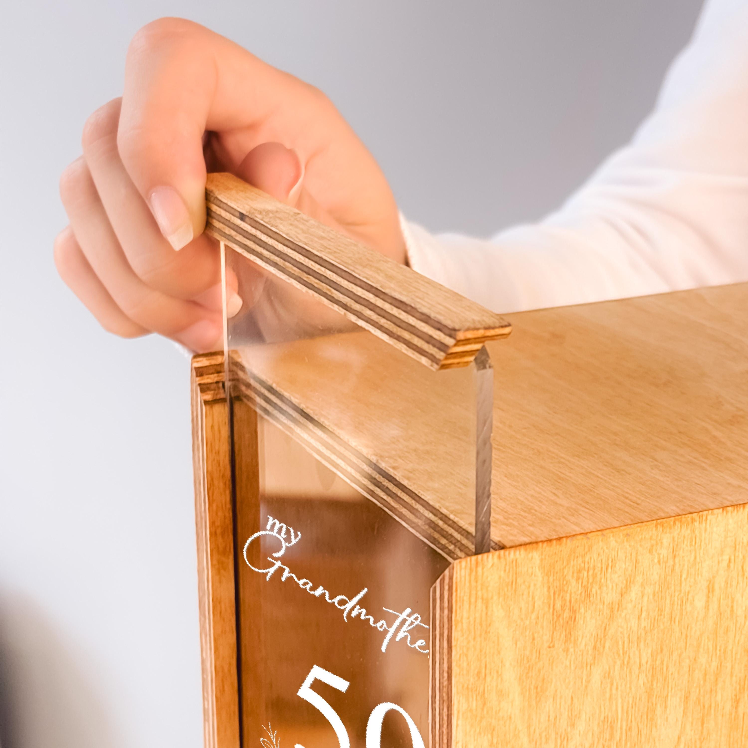 A personalized wine box crafted from rich wood offers a thoughtful way to present a cherished bottle for birthdays, anniversaries, or housewarmings. The elegant design features an acrylic lid with subtle engraved details that add a meaningful touch without overwhelming the gift. Designed to hold a standard wine or champagne bottle, this wooden wine box transforms a simple present into a lasting keepsake.