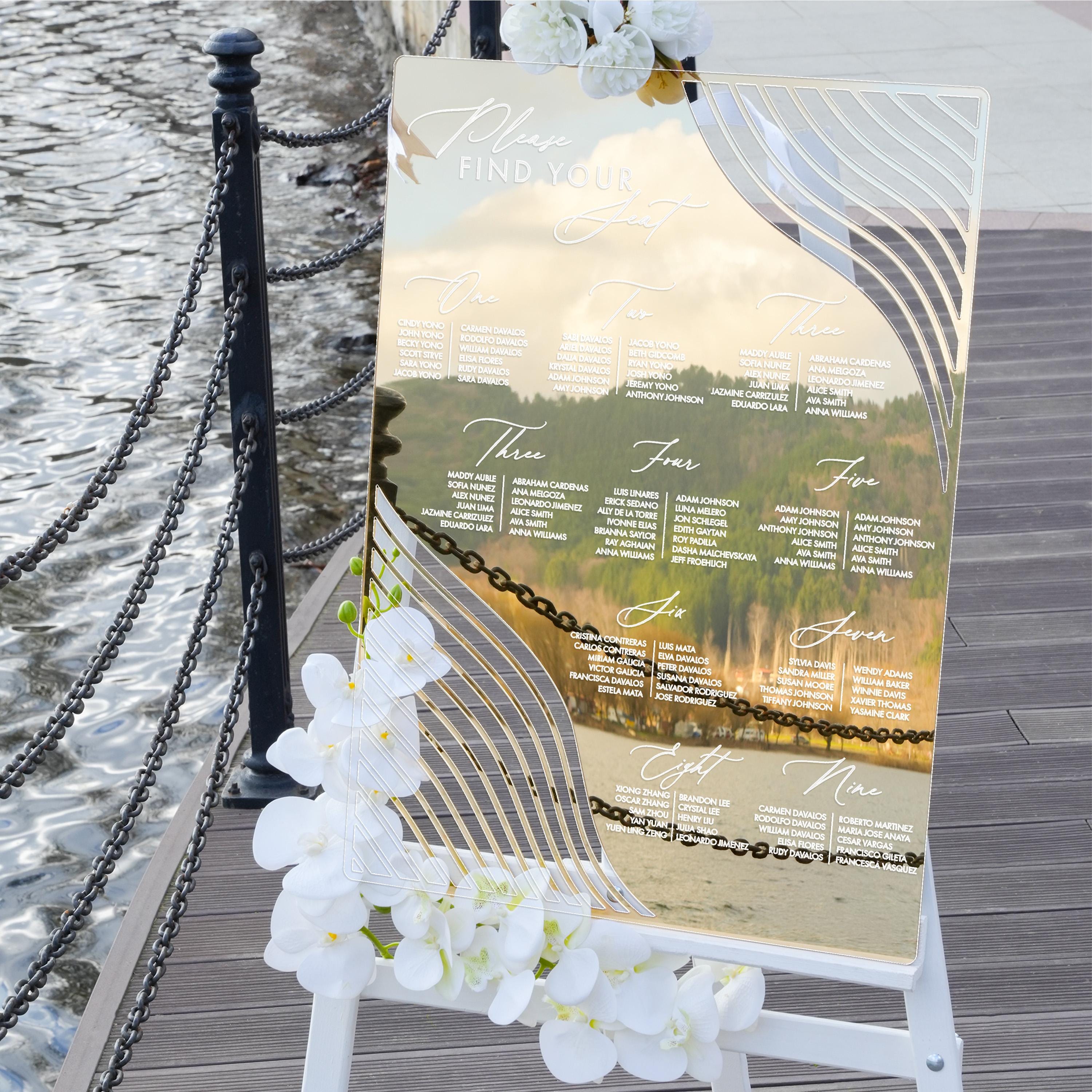 This gold mirror seating chart serves as an elegant wedding seating sign that guides guests to their tables with clarity and style. Designed as a functional and decorative table plan, it enhances the wedding entrance or reception area while providing a clear layout for seamless guest navigation.