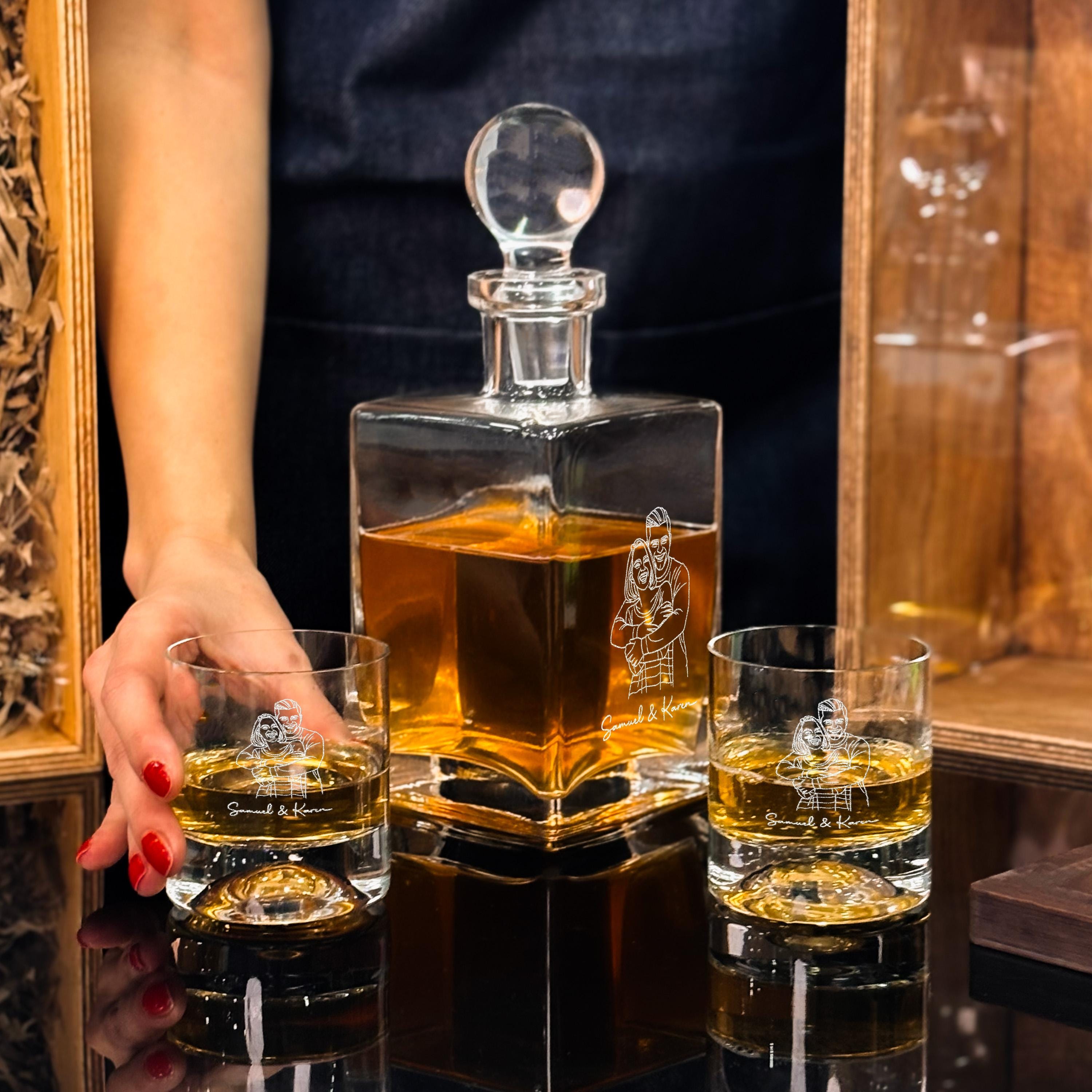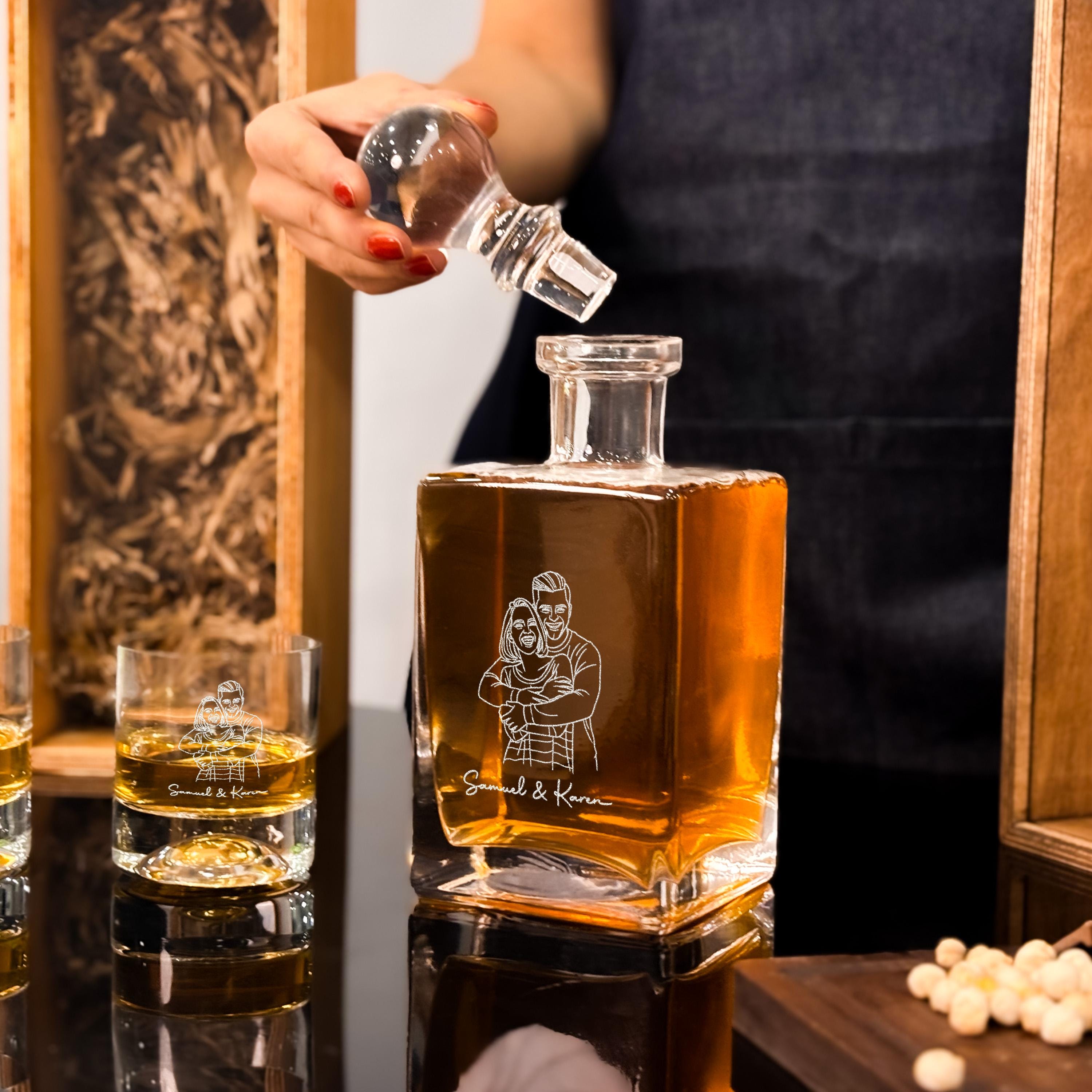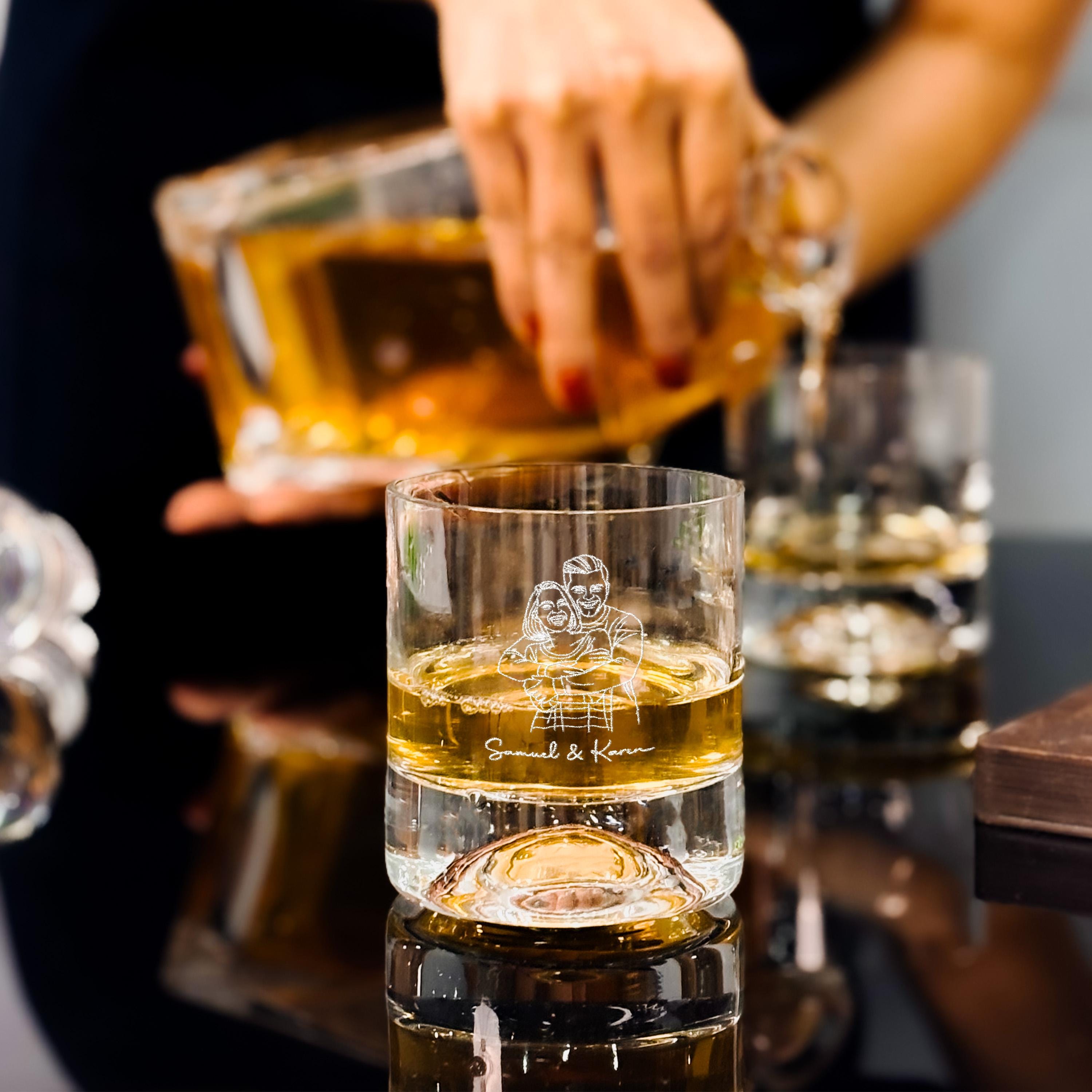 A photo engraved whiskey decanter adds a thoughtful touch to any home bar, bringing warmth to evening drinks or special celebrations. This whiskey decanter set includes personalized bourbon glasses that carry subtle engraved details, making it a meaningful anniversary gift for a husband or a memorable housewarming present. Whether raising a glass to mark a wedding or simply enjoying quiet moments, the custom whiskey gift blends artisan glassware charm with everyday use.
