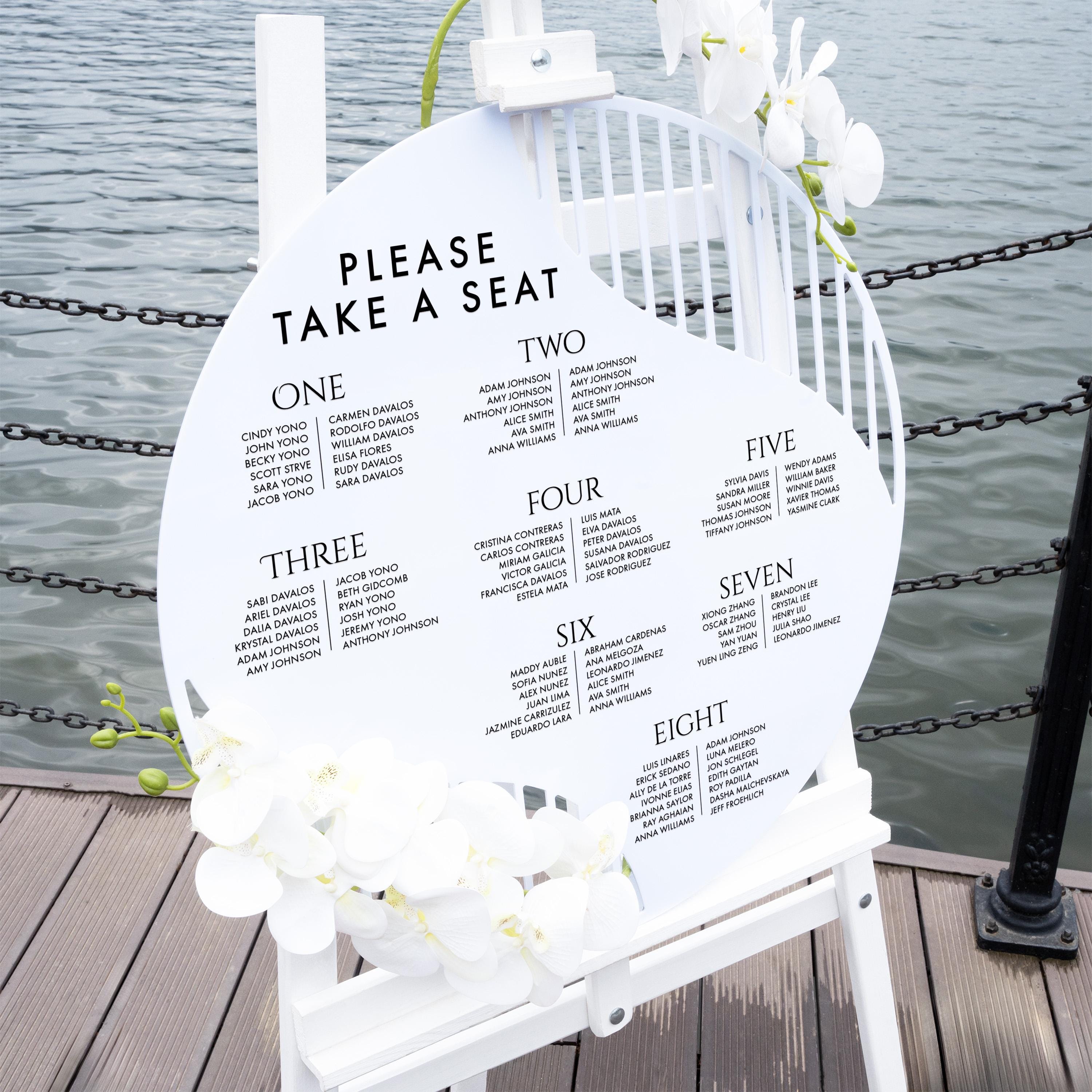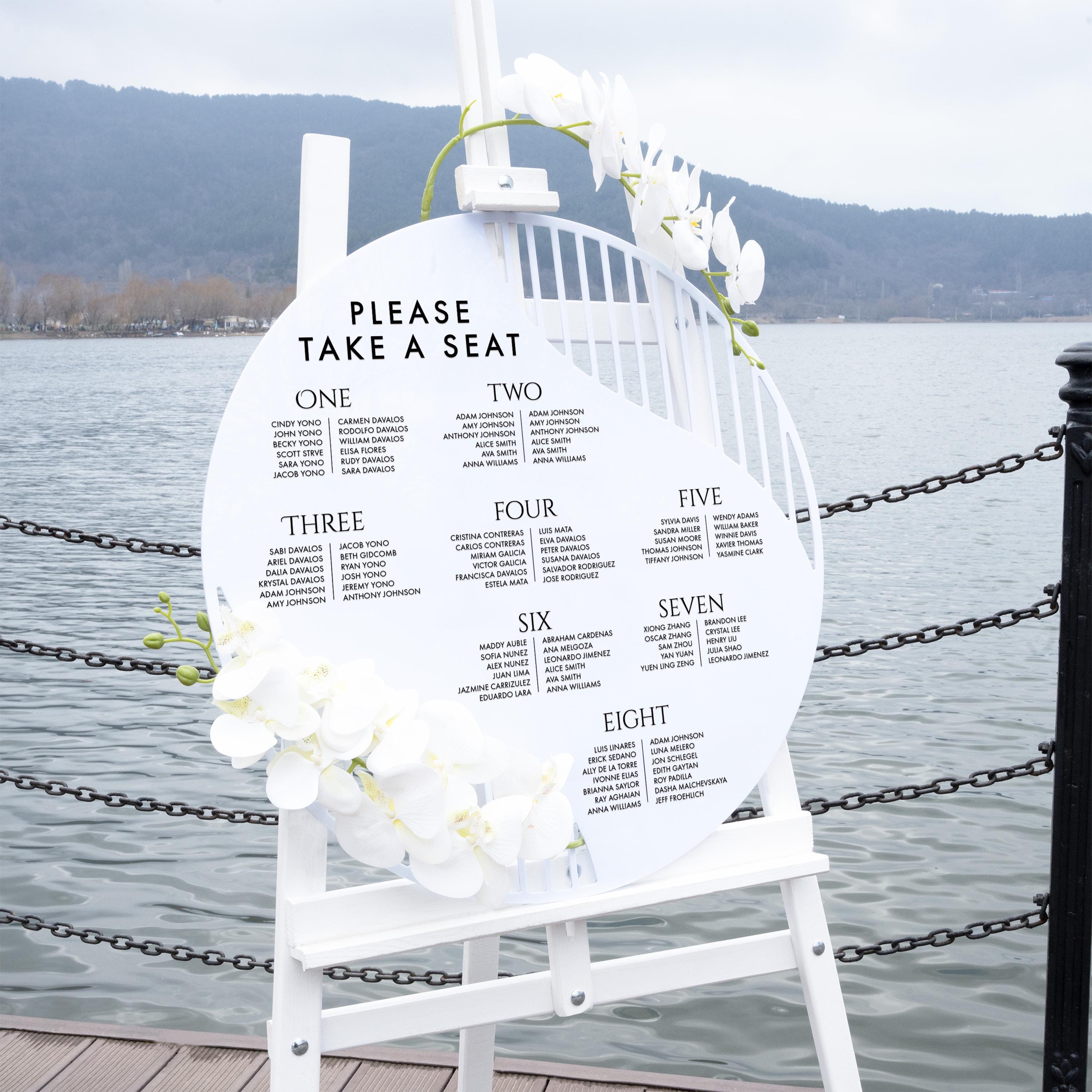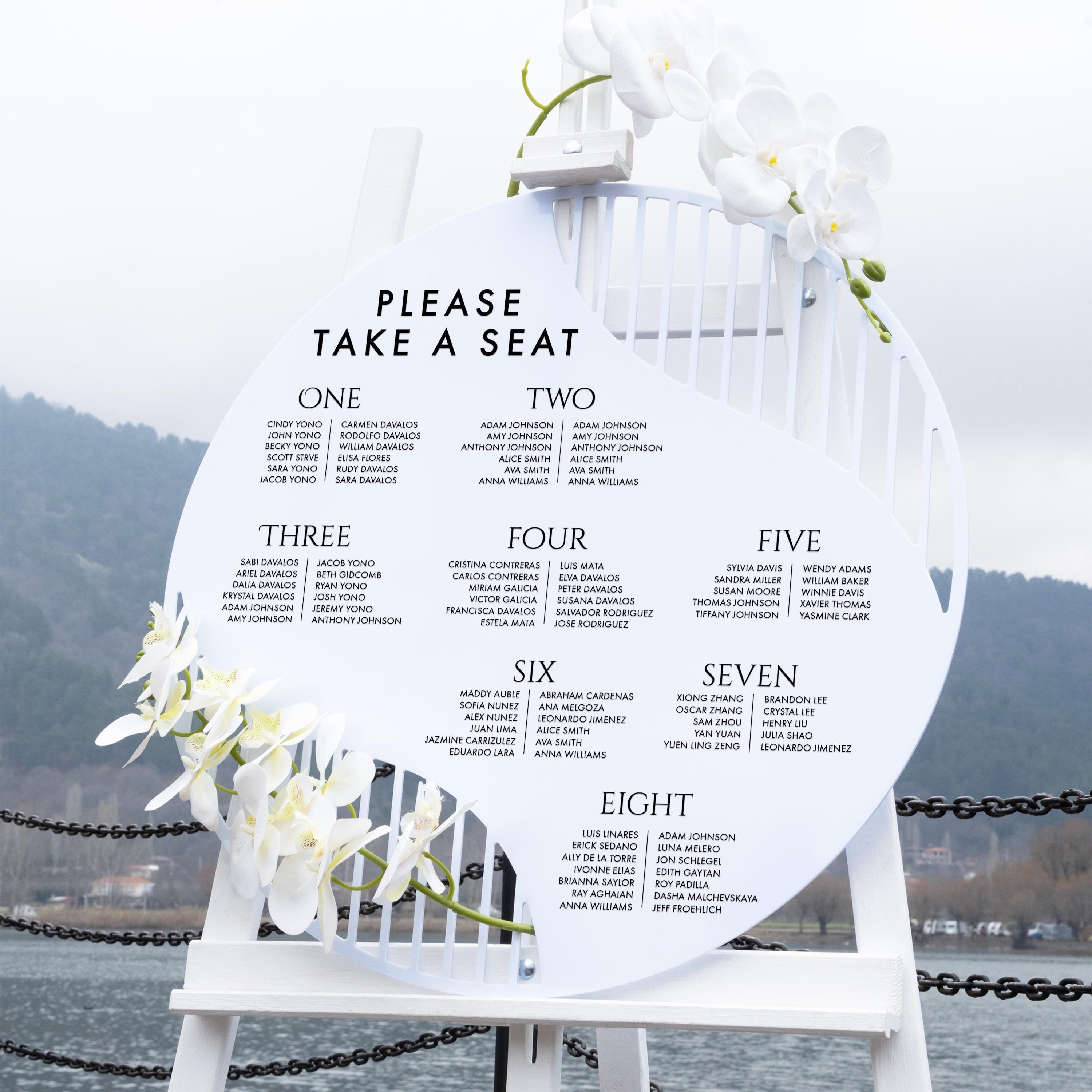 This acrylic wedding seating chart serves as an elegant seating chart sign that guides guests to their tables with ease while enhancing the wedding entrance or reception decor. Combining functionality and style, this table plan creates a clear, personalized seating plan that complements boho wedding decor and gold wedding sign themes.