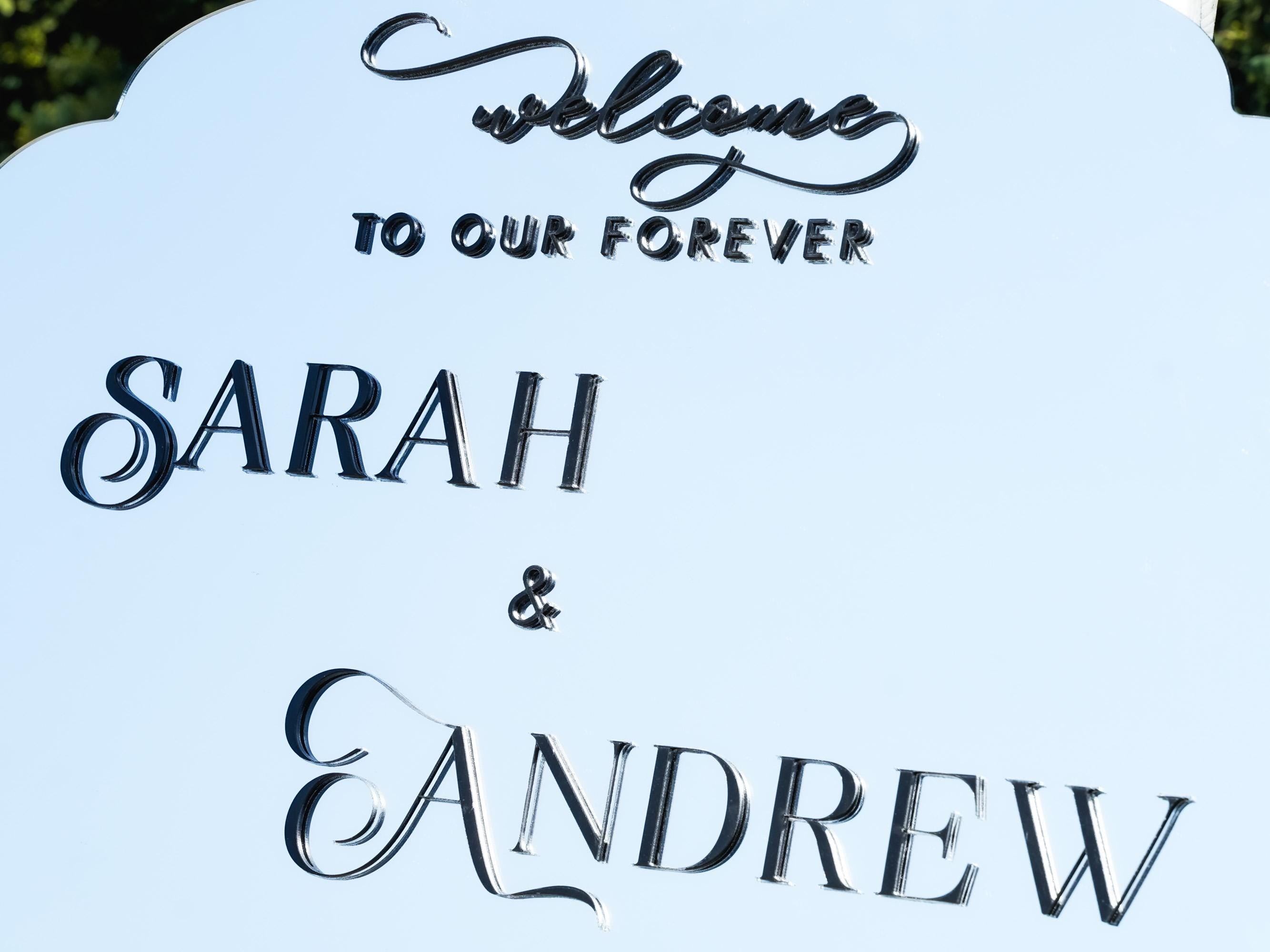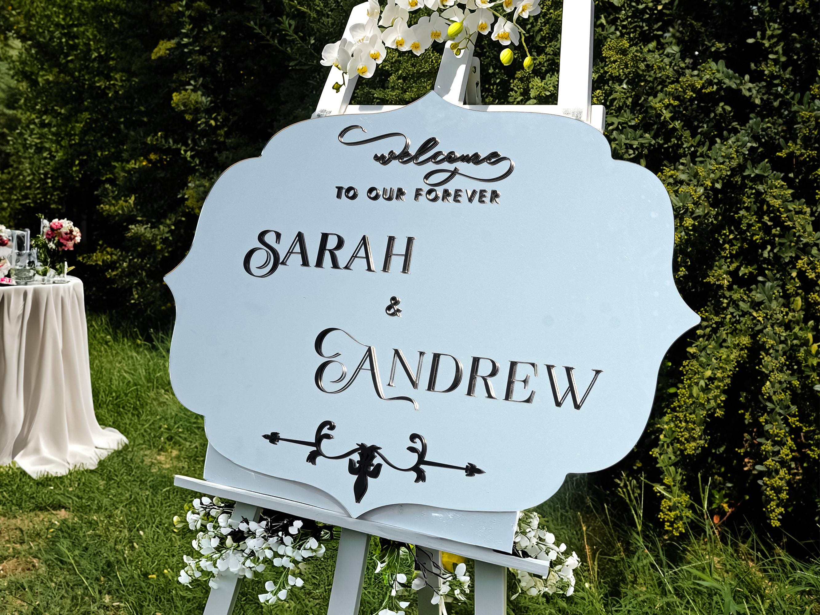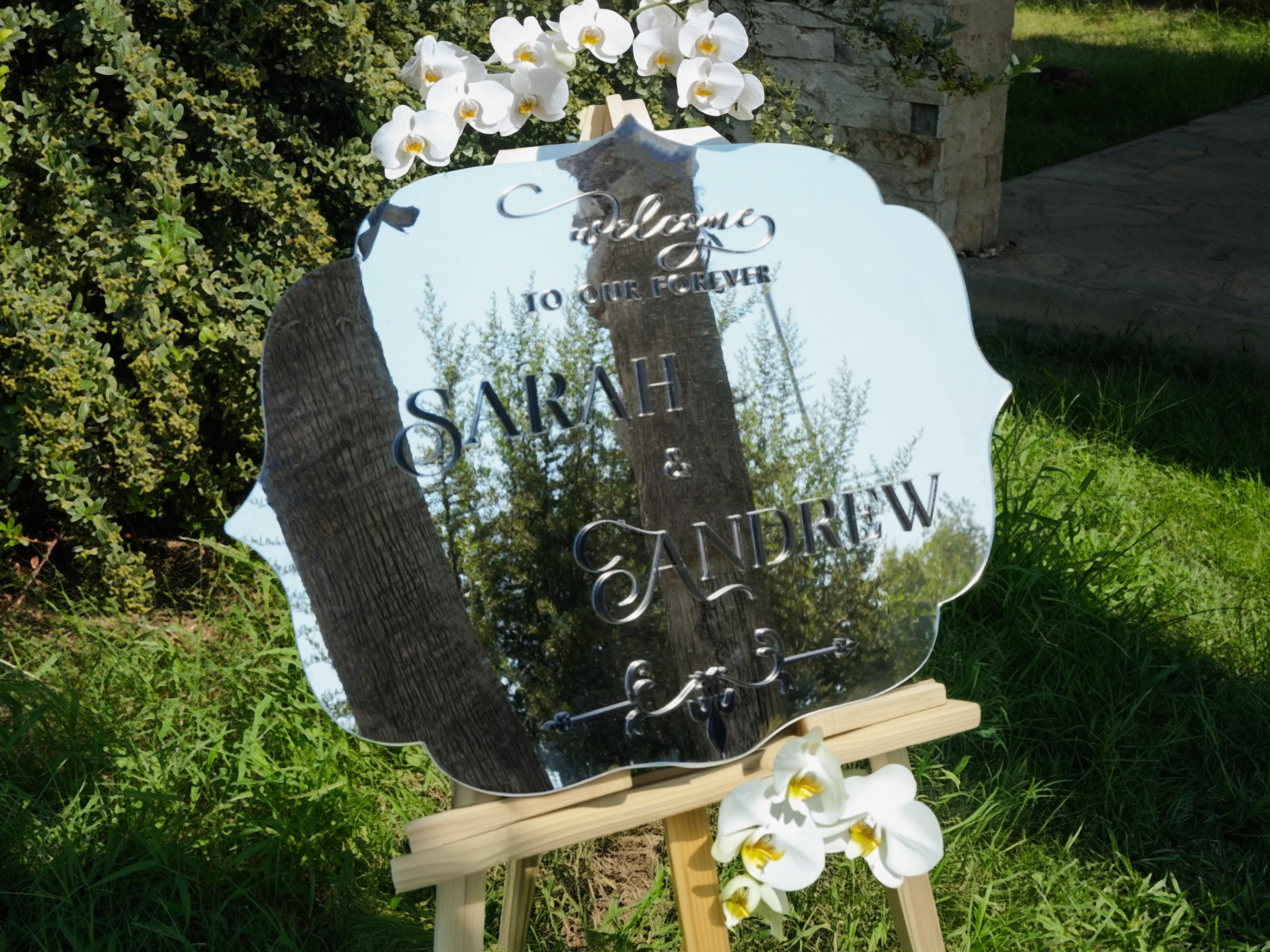 Our silver mirror wedding sign from the Dallas Collection offers a stunning acrylic welcome display that sets an elegant tone for your special day. This custom gold mirror acrylic welcome sign creates a memorable first impression at your wedding or engagement, combining classic style with personalized charm.
