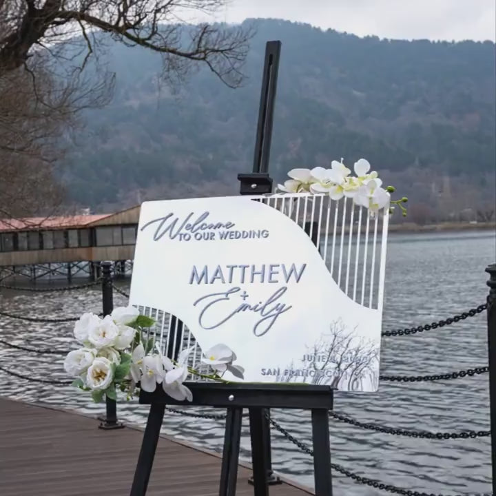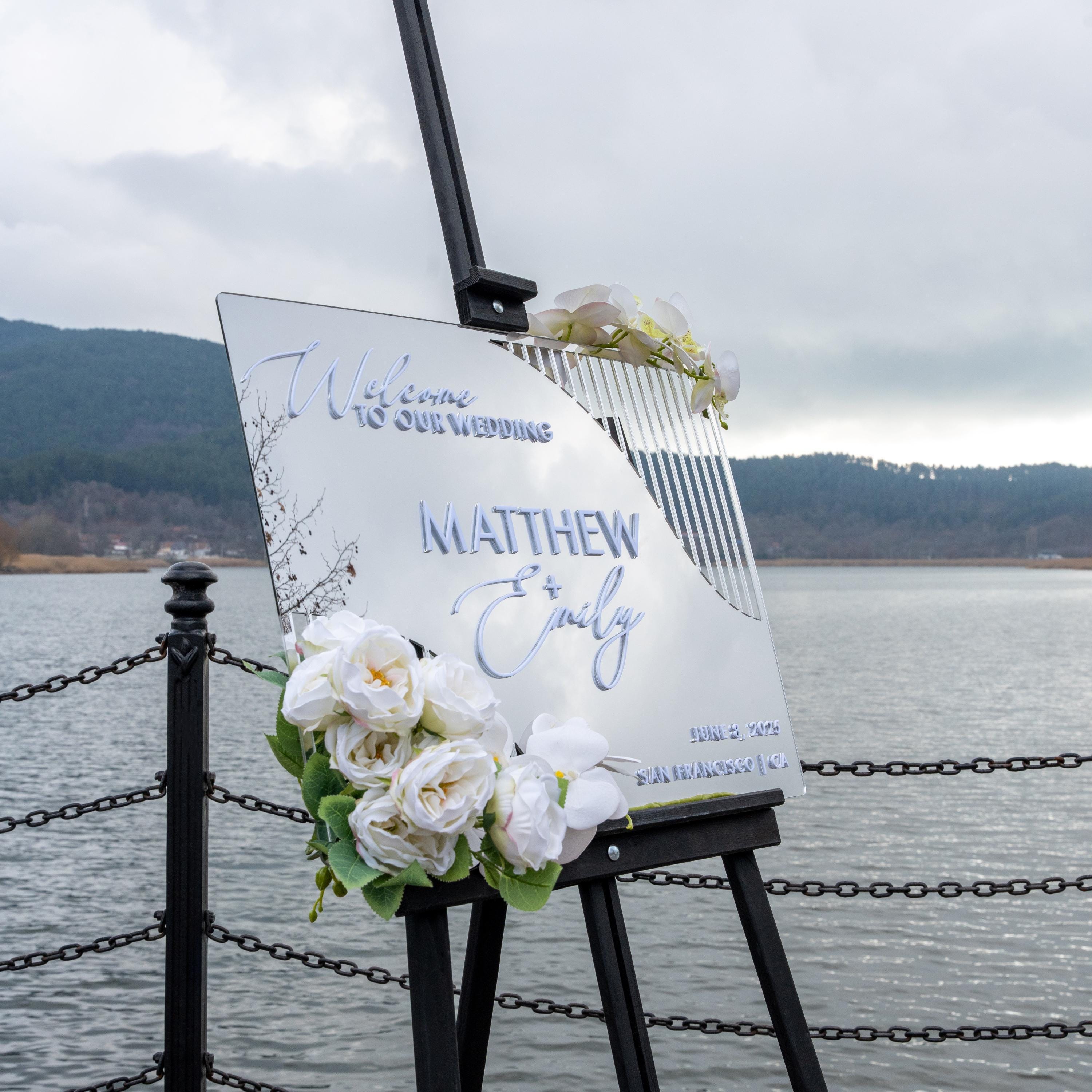 The Boho Silver Mirror Wedding Welcome Sign from the New York Collection is a stunning silver mirror wedding sign designed to create a memorable first impression at your wedding entrance. This elegant acrylic wedding decor features 3D raised white lettering that adds depth and sophistication, making it the perfect personalized wedding sign to welcome your guests with style.