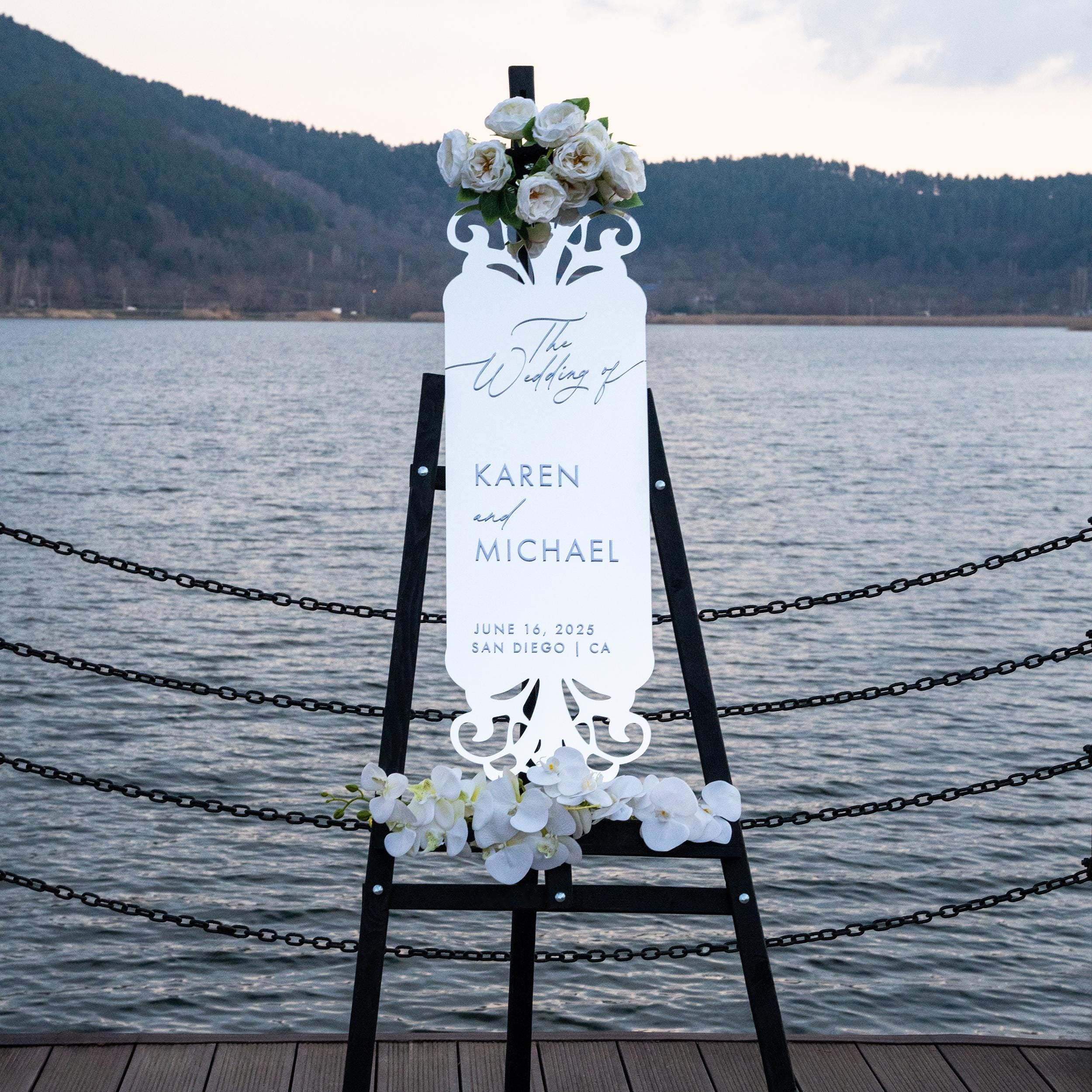 This acrylic wedding sign from the Iris Collection serves as a stunning welcome piece that sets a graceful tone for your ceremony, showcasing elegant silver mirror acrylic craftsmanship designed to impress guests from the moment they arrive.