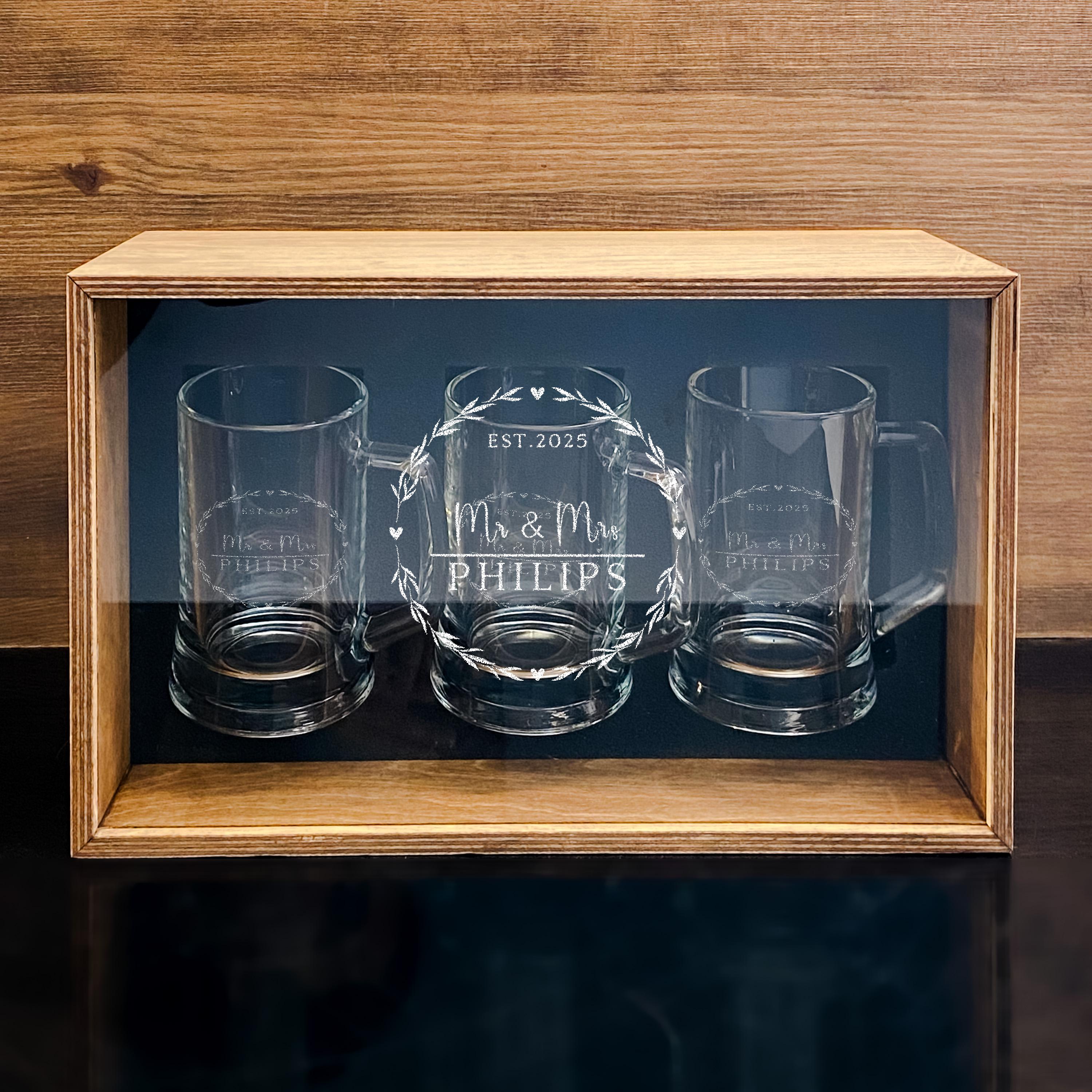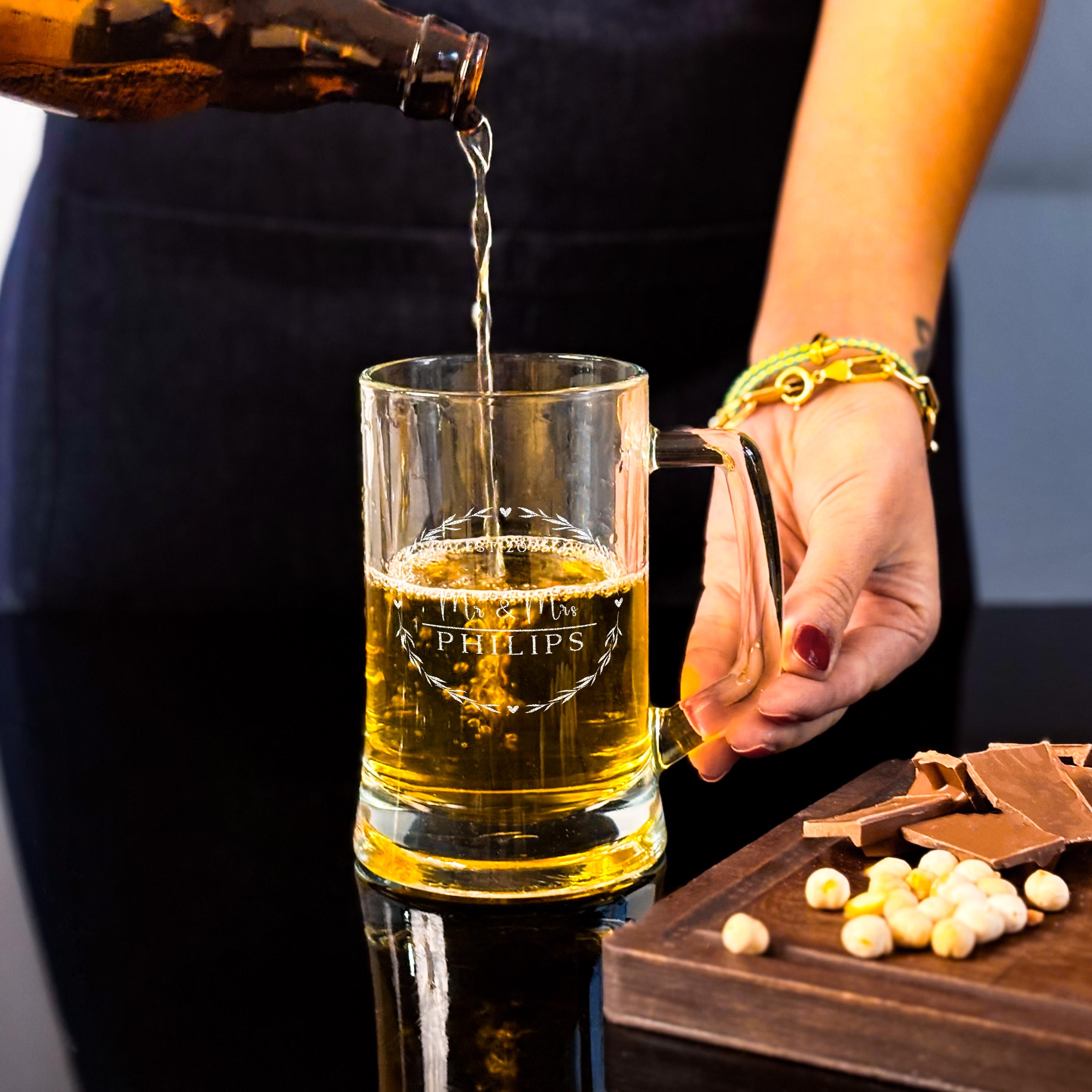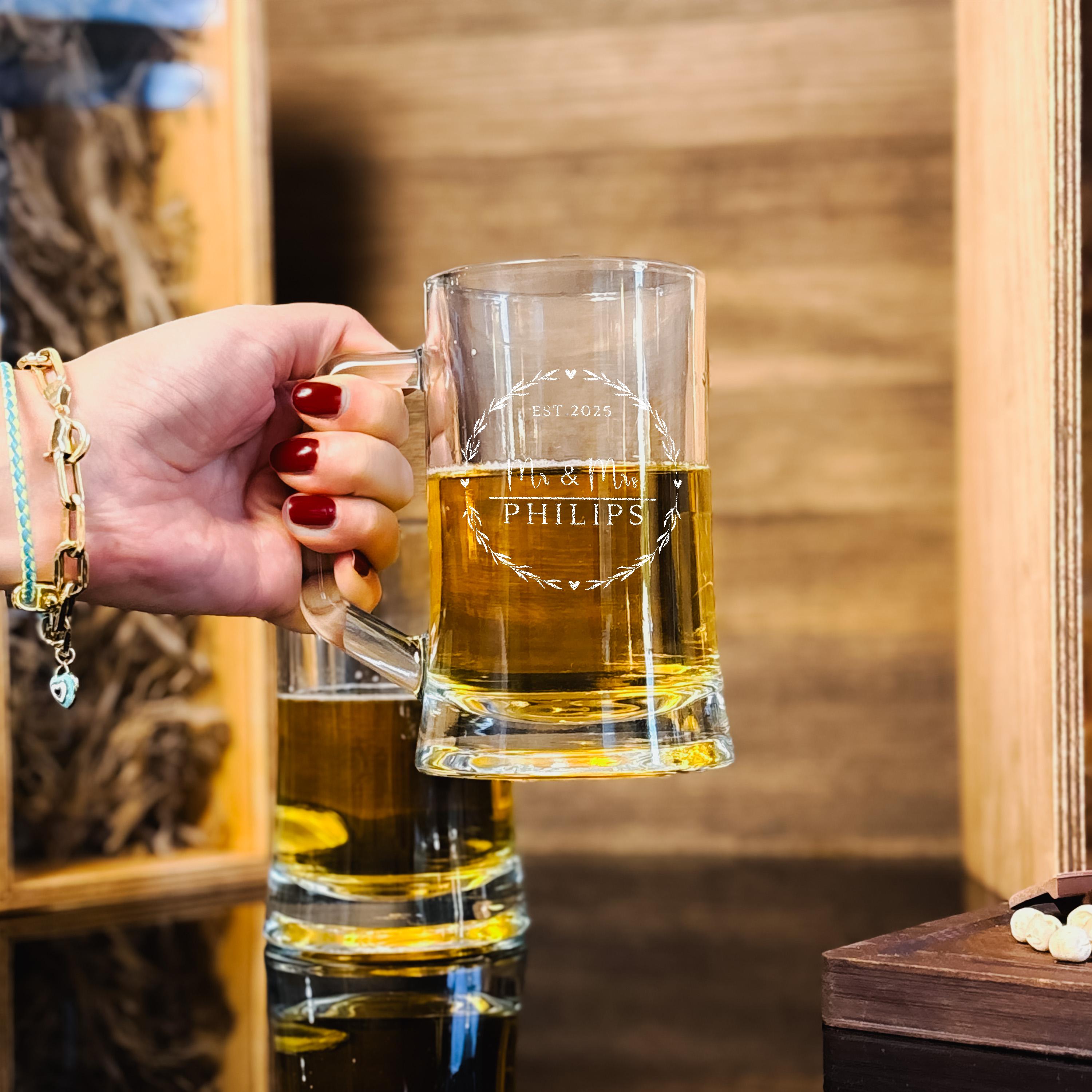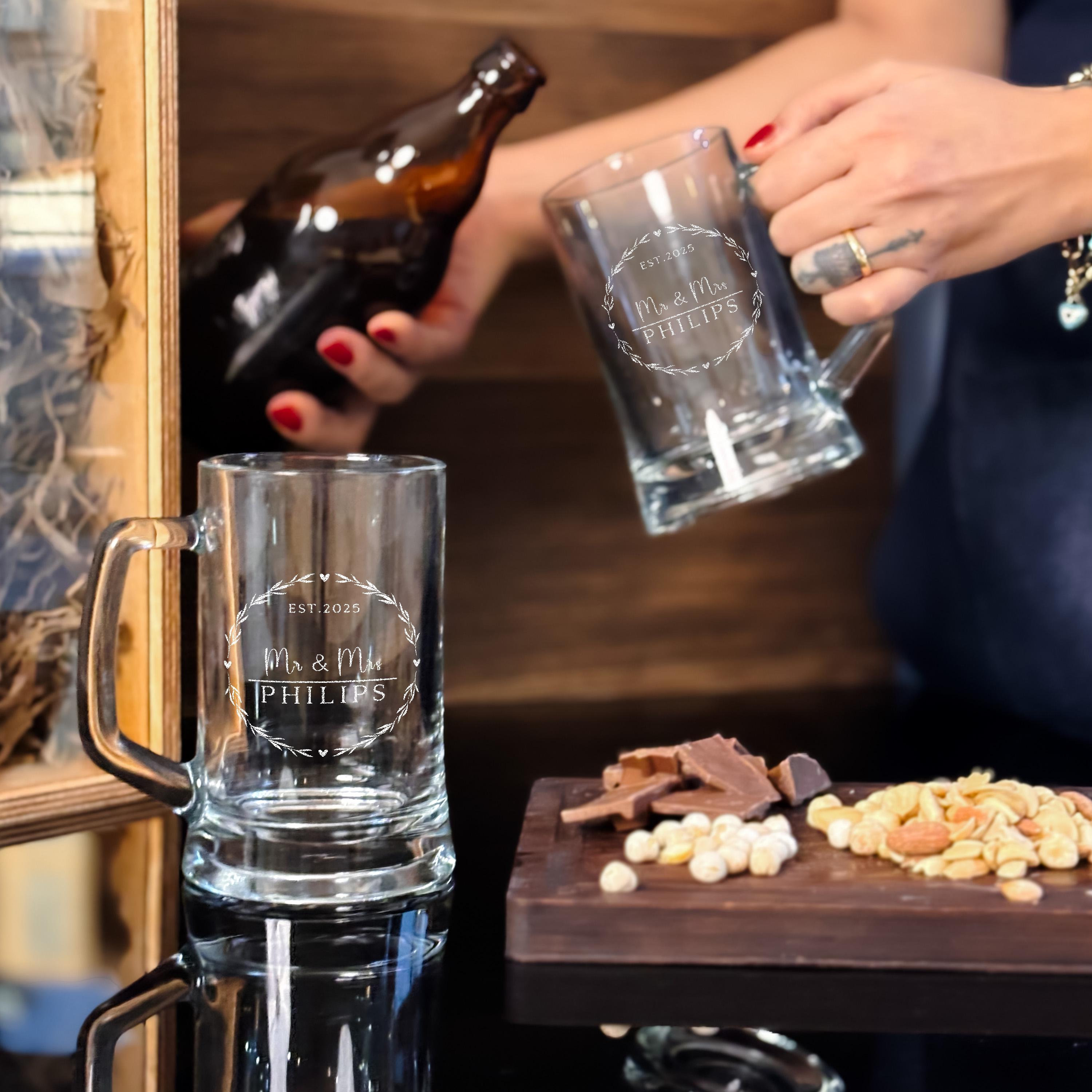 A wedding beer glass engraved with Mr and Mrs adds a personal touch to celebrations, perfect for toasting at receptions or casual home gatherings. These custom beer glasses bring a timeless wedding style to any occasion, making them thoughtful gifts for couples, groomsmen, or even a father of the bride. Whether used during lively parties or quiet moments, the beer mug with handle blends function and sentiment effortlessly.