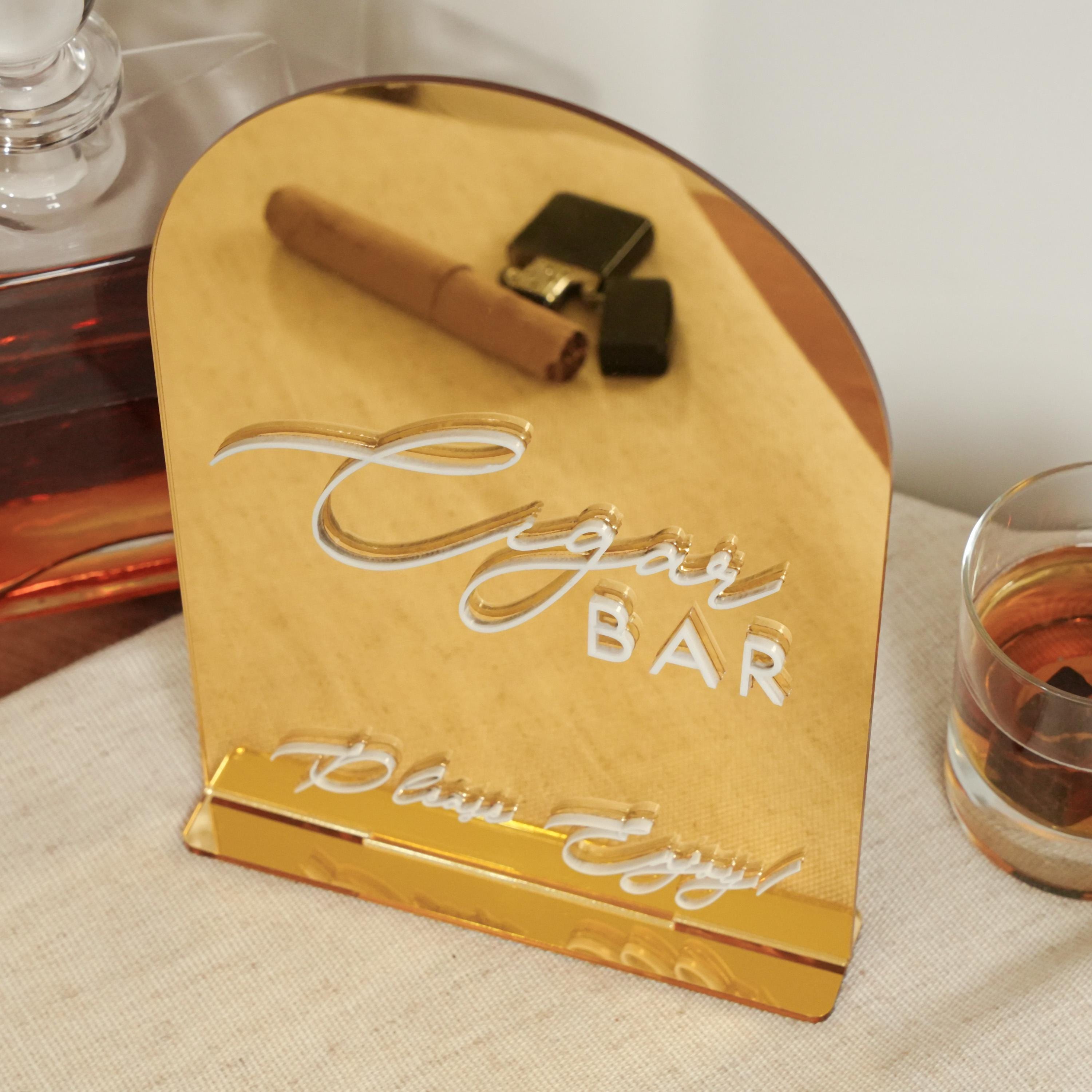Add a touch of sophistication to your celebration with our modern Cigar Bar acrylic sign. Featuring 3D raised lettering and a sleek arched design, this sign brings bold elegance to your wedding, bachelor party, or upscale event. A perfect detail to complete your lounge or bar setup.