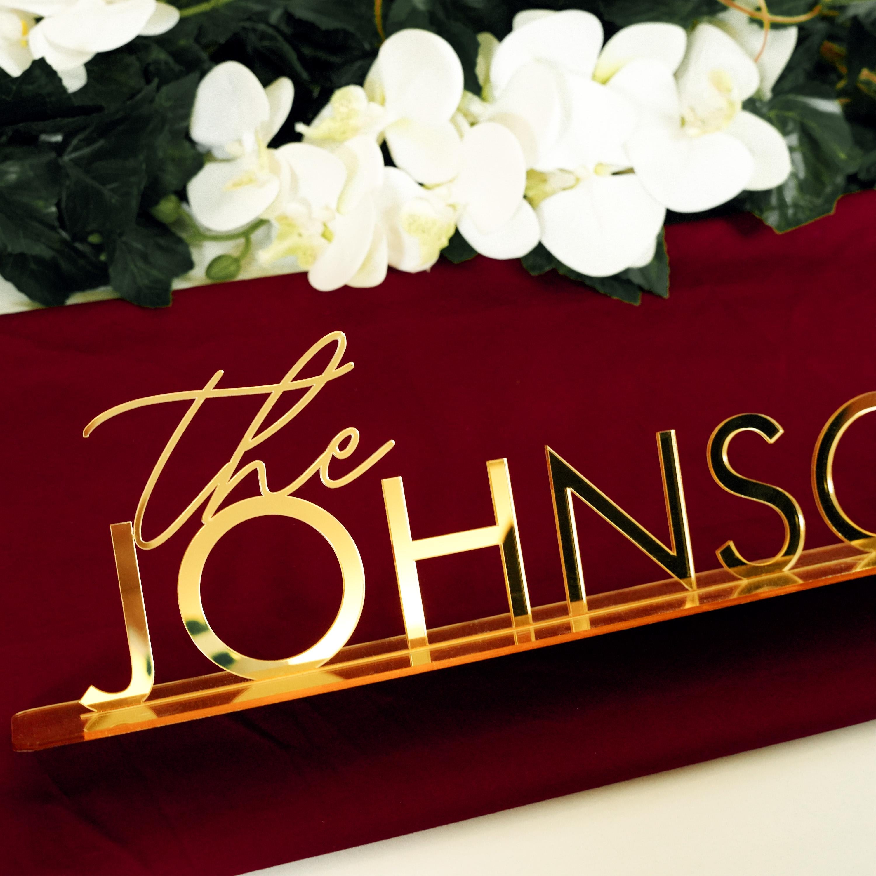 Elevate your sweetheart table with this elegant gold mirror wedding sign, perfect for displaying the bride and groom's names or a charming Mr and Mrs. This decorative table signage creates a warm, intimate atmosphere ideal for weddings, engagements, or birthday celebrations.