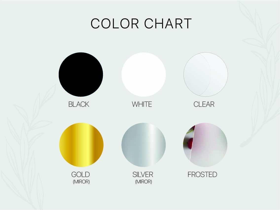 - Colors: Clear, Frosted, White, Black, Mirror Gold, Mirror Silver(The back surfaces of the gold and silver acrylic options are gray in color. To achieve a mirror effect, only the front surfaces are produced in gold and silver colors. When you choose a "Clear" background, please be aware that adhesive residues may be visible on the back of the product due to its transparency.)