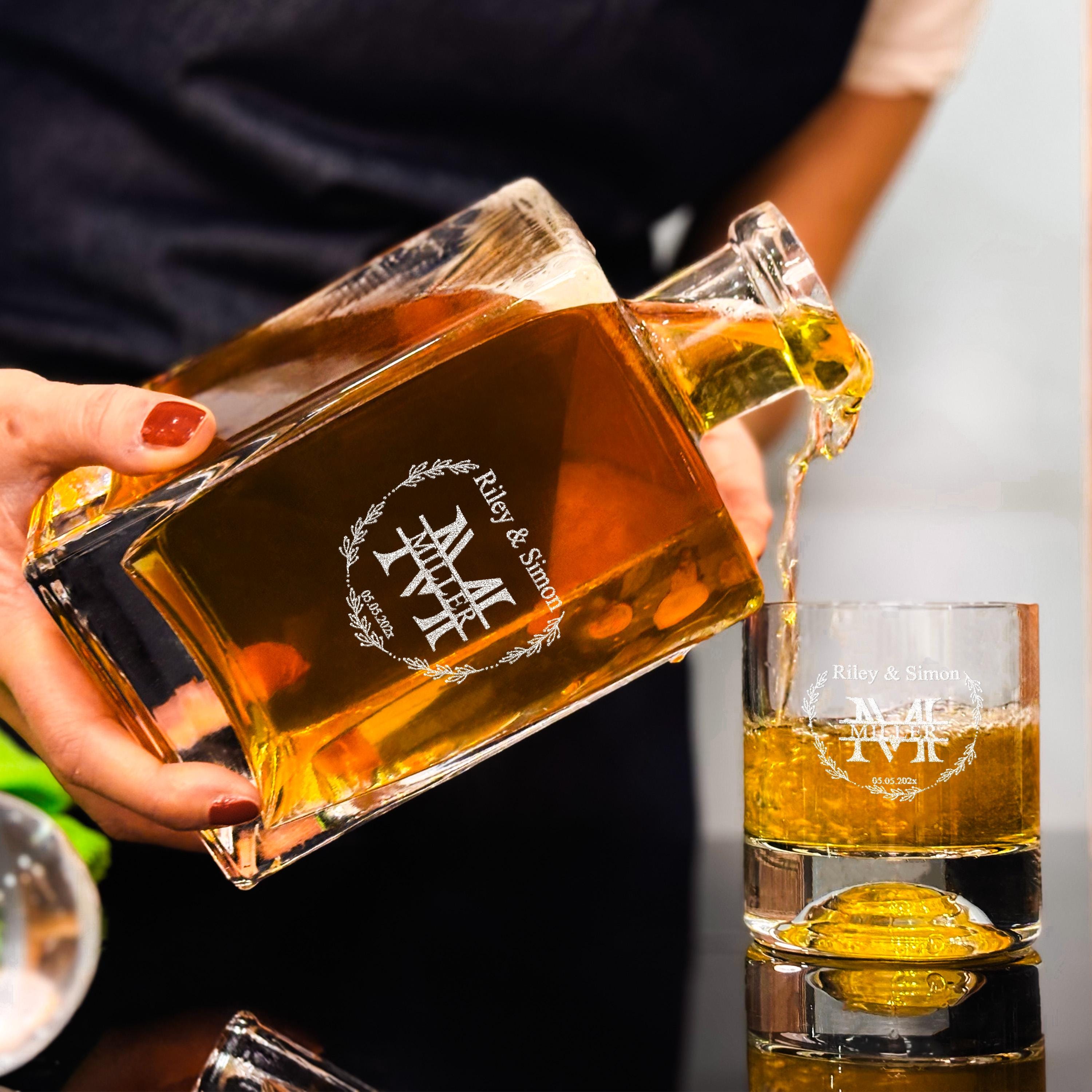 This wedding whiskey decanter brings a refined touch to any home bar, offering a personalized decanter set that enhances evening drinks or special celebrations. The custom engraved gifts, including bourbon glass sets and hand-blown glassware, add a unique charm that suits anniversaries, housewarmings, or engagement gift ideas with subtle elegance.