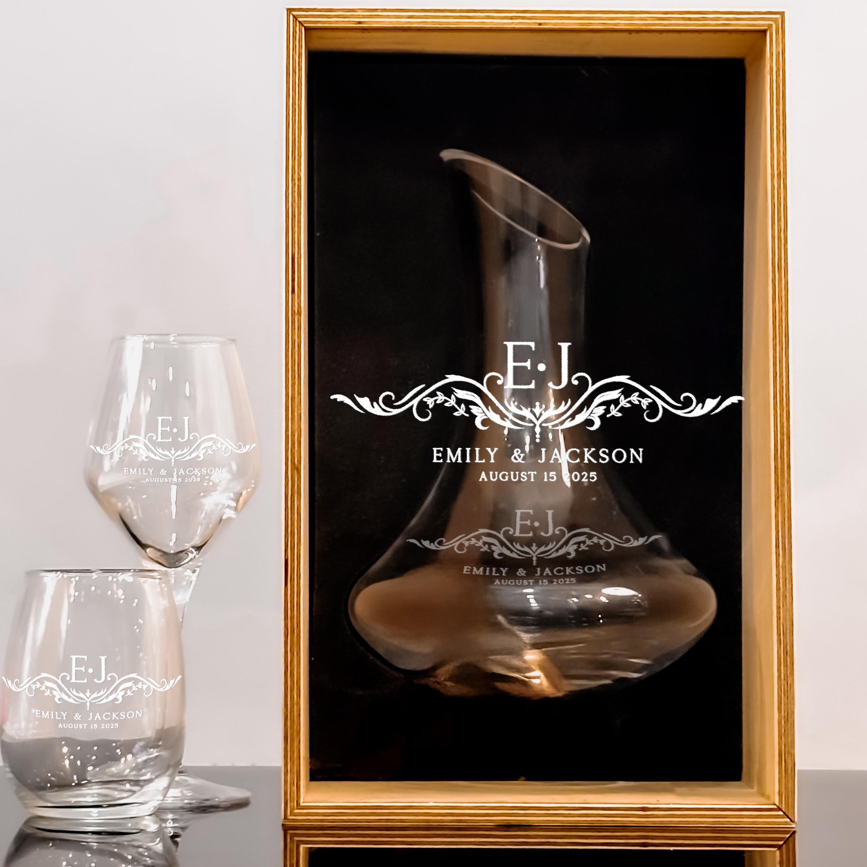 Celebrate love with this wedding wine decanter set, designed as an elegant and personalized gift perfect for weddings, housewarmings, or newlywed celebrations. The set includes custom engraved stemless wine glasses and a matching decanter, creating a timeless keepsake that elevates every toast. For a refined presentation, choose the optional wood gift box to make your gift truly unforgettable.